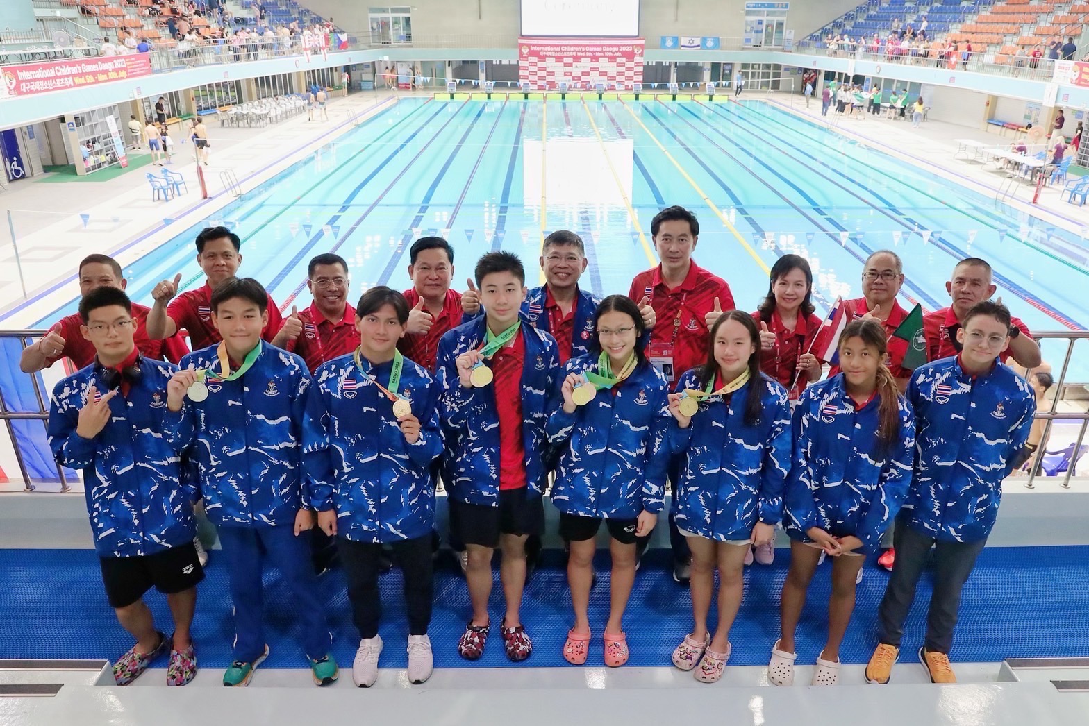 เกาหลี-(8 ก.ค. 66) นายภิมุข สิมะโรจน์ เลขานุการผู้ว่าราชการกรุงเทพมหานคร ในฐานะผู้แทนนายชัชชาติ สิทธิพันธุ์ ผู้ว่าราชการกรุงเทพมหานคร พร้อมด้วย นายขจิต ชัชวานิชย์ ปลัดกรุงเทพมหานคร ในฐานะผู้จัดการทีม และนายสมบูรณ์ หอมนาน ผู้อำนวยการสำนักวัฒนธรรม กีฬา และการท่องเที่ยว ในฐานะผู้ช่วยผู้จัดการทีม ร่วมเชียร์นักกีฬาว่ายน้ำกรุงเทพมหานคร ในการแข่งขันกีฬายุวชนโลก ครั้งที่ 55 ณ สระว่ายน้ำ Duryu เมืองแทกู สาธารณรัฐเกาหลี หลังเสร็จสิ้นการแข่งขันวันที่ 2 นักกีฬายุวชนกทม.กวาดเหรียญรวม 9 ทอง 7 เงิน 3 ทองแดง