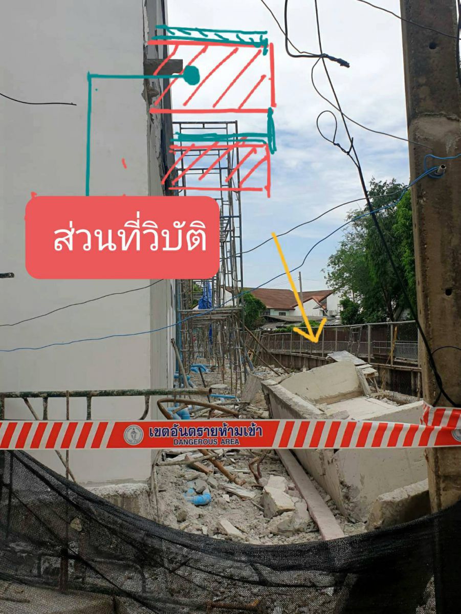 นายธวัชชัย นภาศักดิ์ศรี ผู้อำนวยการสำนักการโยธา (สนย.) กทม.กล่าวว่า จากการตรวจสอบอาคารที่เกิดเหตุเป็นงานก่อสร้างอาคาร ค.ส.ล.2 ชั้น เพื่อใช้เป็นศูนย์เด็กก่อนเกณฑ์ของวัดบางเตย ซอยนวมินทร์ 60 ถนนนวมินทร์ โดยไม่ได้รับอนุญาต ในส่วนที่มีการวิบัติเป็นคานและพื้นของระเบียง ชั้น 2 ด้านทิศตะวันออกของอาคาร ซึ่งไม่ได้ก่อสร้างพร้อมกับตัวอาคารตั้งแต่แรก แต่เจาะเสียบเหล็กส่วนของคานและพื้นระเบียงยึดกับโครงสร้างเดิม ซึ่งเป็นวิธีการก่อสร้างที่ไม่เป็นไปตามมาตรฐานหลักวิศวกรรม ทำให้เกิดการวิบัติในส่วนดังกล่าว