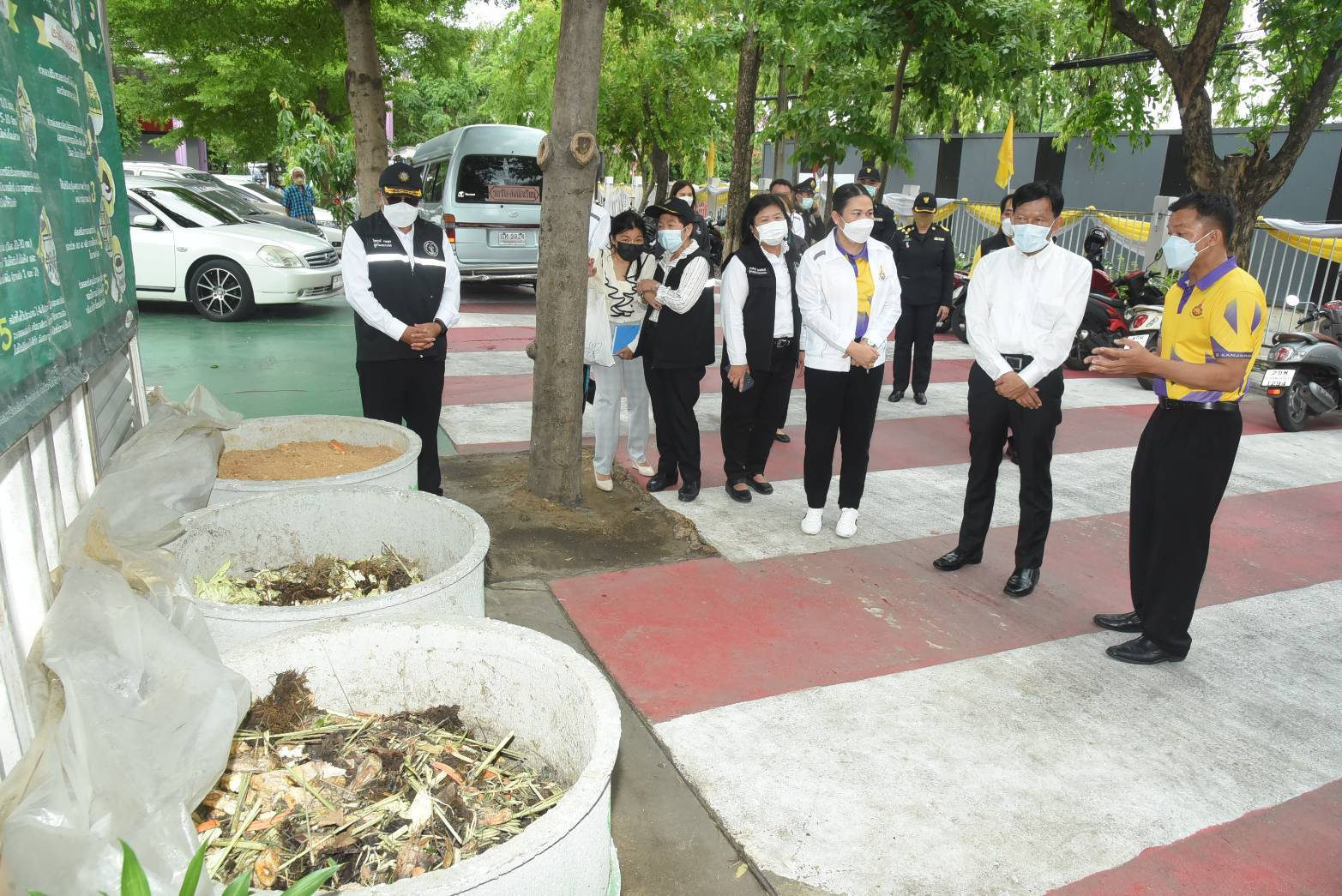 พร้อมกันนี้ได้สอบถามถึงการคัดแยกขยะภายในสำนักงานเขตห้วยขวาง มีข้าราชการและบุคลากร 708 คน วิธีการคัดแยกขยะ โดยจำแนกตามประเภทของขยะ จัดกิจกรรมรณรงค์การจัดการขยะที่ต้นทาง ดังนี้ 1.ขยะรีไซเคิล ทิ้งขยะรีไซเคิลลงถังที่ได้จัดเตรียมไว้ ซึ่งแต่ละฝ่ายส่งมอบให้แม่บ้านจัดเก็บเพื่อจำหน่ายต่อไป 2.ขยะอินทรีย์ ทิ้งขยะเศษอาหารลงถังที่ได้จัดเตรียมไว้ ฝ่ายรักษาความสะอาดฯ จัดเก็บและส่งมอบให้เกษตรกรนำไปเลี้ยงสัตว์ 3.ขยะอันตราย ทิ้งขยะอันตรายลงถังที่ได้จัดเตรียมไว้ ฝ่ายรักษาความสะอาดฯ จัดเก็บและนำไปกำจัดที่ศูนย์กำจัดขยะสายไหม 4.ขยะทั่วไป ทิ้งขยะทั่วไปลงถังที่ได้จัดเตรียมไว้ แต่ละฝ่ายดำเนินการจัดเก็บและส่งมอบให้แม่บ้านรวบรวมไว้ที่จุดพักขยะของฝ่ายรักษาความสะอาดฯ สำหรับปริมาณขยะก่อนคัดแยกและหลังคัดแยก ดังนี้ ขยะทั่วไปก่อนคัดแยก 400 กิโลกรัม/วัน หลังคัดแยก 300 กิโลกรัม/วัน ขยะรีไซเคิลก่อนคัดแยก 5 กิโลกรัม/วัน หลังคัดแยก 25 กิโลกรัม/วัน ขยะอินทรีย์หลังคัดแยก 7 กิโลกรัม/วัน ขยะอันตรายหลังคัดแยก 3 กิโลกรัม/วัน ขยะติดเชื้อก่อนคัดแยก 3 กิโลกรัม/วัน หลังคัดแยก 2 กิโลกรัม/วัน ทั้งนี้ รองผู้ว่าราชการกรุงเทพมหานคร ได้มอบหมายให้เขตฯ พิจารณาปรับเปลี่ยนขนาดรถเก็บขนมูลฝอย ให้เหมาะสมกับปริมาณขยะที่จัดเก็บในแต่ละพื้นที่ รวมถึงเพิ่มจำนวนเที่ยวในการจัดเก็บขยะเป็น 2 ครั้ง/สัปดาห์ เพื่อไม่ให้เกิดปัญหาขยะตกค้างในพื้นที่