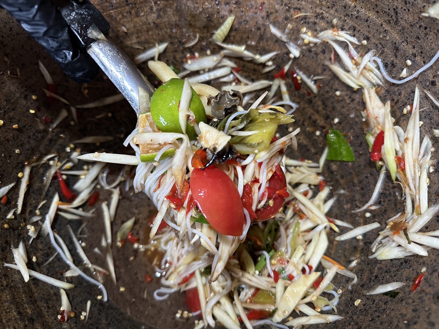 ส่วนการตำที่กำลังถ่ายทำคือ ตำป่ารวมมิตรเส้นแก้วใส่บะหมี่แห้งลวกสุก อันดับแรกตำพริกแห้งตามขนาดที่ลูกค้าต้องการ ใส่น้ำปลาร้าปรุงสุกสูตรเด็ดประจำร้าน ใส่น้อยขมต้มสุกแกะเปลือก ใส่แครอทและเส้นมะละกอที่สับแล้วจากมีดสดๆ มะนาวสดจากลูกสีเขียว ใส่ถั่วฟักยาวหั่นเป็นชิ้นๆเท่าข้อนิ้วมือเพิ่มสีสันให้น่ากิน ใส่หมูยอหั่นเป็นชิ้นเล็กๆ พร้อมเสิร์ฟใส่ถุงให้ลูกค้านำกลับไปทานที่บ้านได้เลยในราคา 60 บาท