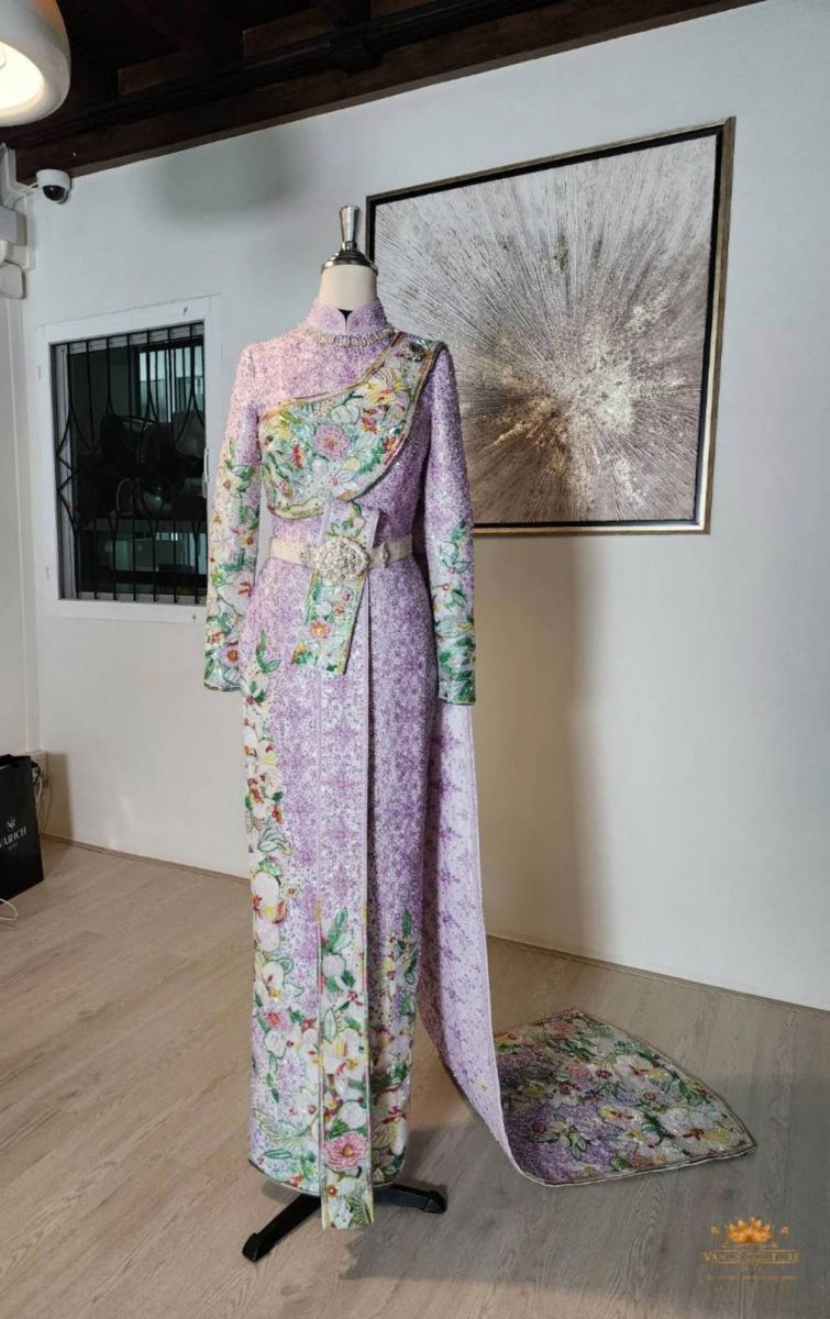 โดยทางห้องเสื้อเลือกใช้ผ้าไหมโคราช หรือ ผ้าไหมปักธงชัย สีชมพูกลีบบัวอ่อนนำมาตัดเย็บ ตัวผ้านำมาพิมพ์ลายแบบไล่สี รวมถึงใส่ลวดลายของบุปผาราชินีให้มีลักษณะจัดเป็นช่อดอกไม้ที่สวยงาม และเพื่อให้ได้ผลงานที่โก้หรูและสามารถนำไปสวมใส่ได้จริง จึงได้ใช้คริสตัลสวารอฟสกี้ในการปักบนตัวชุดระดับโอวกูตูร์ ซึ่งเป็นที่นิยมมากในวงการแฟชั่นและเหล่าสตรีชั้นสูง อีกทั้งยังสะท้อนถึงรสนิยมและความทันสมัยของผู้สวมใส่ชุดมากยิ่งขึ้น