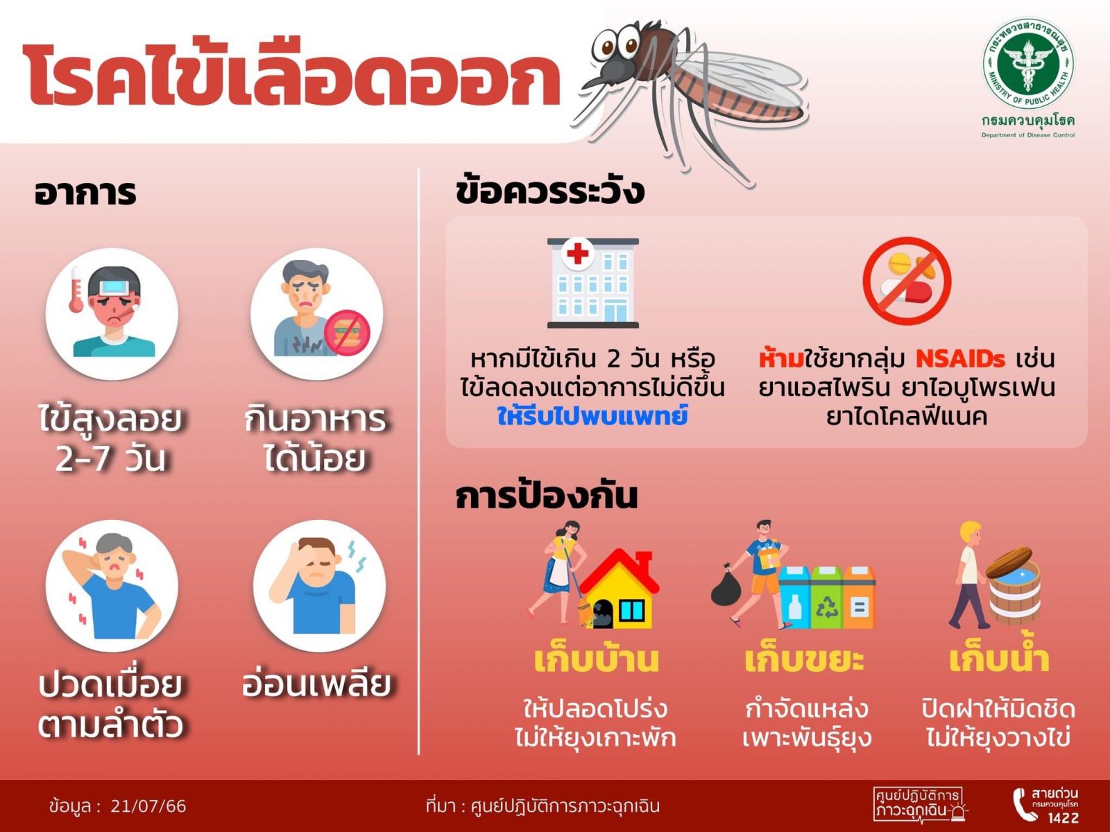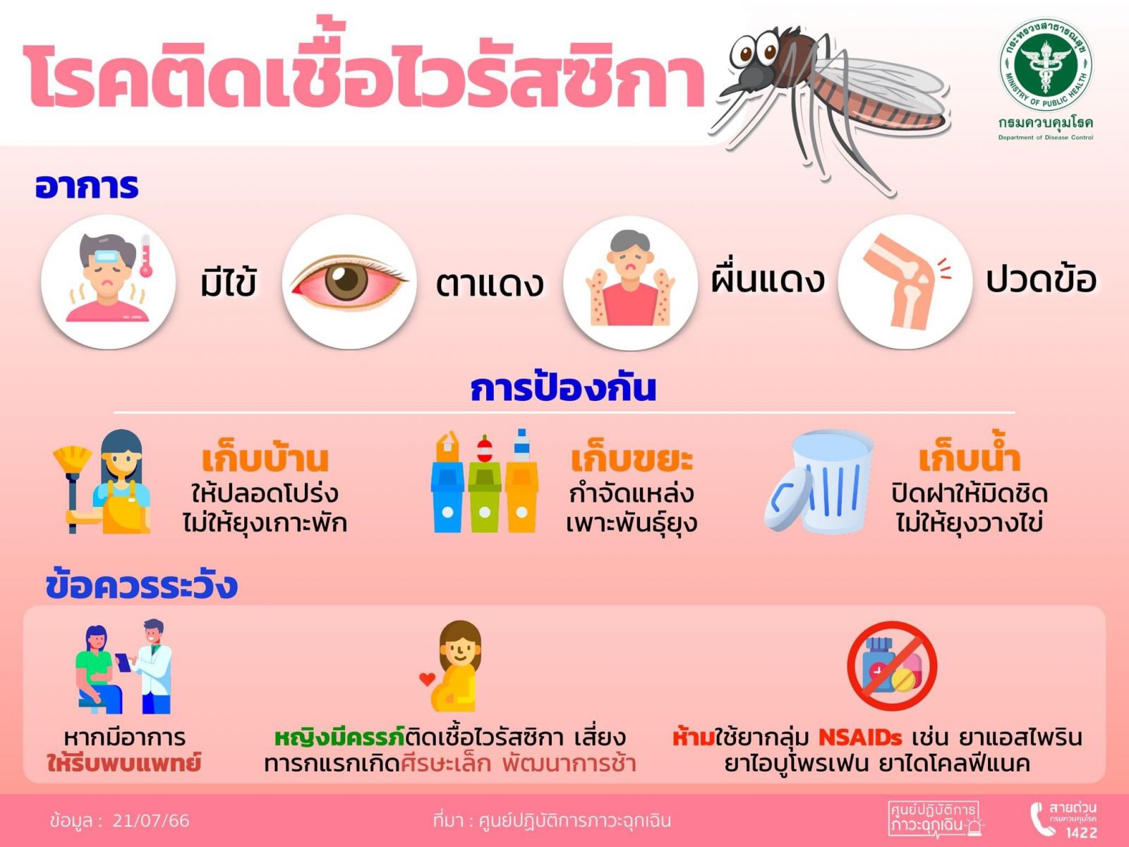 ขณะเดียวกันยังได้ดำเนินมาตรการป้องกันโรคติดเชื้อไวรัสซิกา โรคไข้เลือดออก โรคไข้ปวดข้อยุงลาย (ชิคุนกุนยา) และโรคที่มียุงลายเป็นพาหะ โดยให้ทุกโรงพยาบาลในสังกัดสำรวจตรวจสอบจุดที่มีน้ำขังและกำจัดแหล่งเพาะพันธุ์ยุงลายภายในโรงพยาบาลและบริเวณโดยรอบโรงพยาบาล รวมถึงจัดกิจกรรมรณรงค์ให้ความรู้เรื่องโรคที่เกิดจากยุงลาย วิธีป้องกัน และวิธีการสำรวจและกำจัดแหล่งเพาะพันธุ์ยุงลายแก่ประชาชนผู้รับบริการและบุคลากรในสังกัด พร้อมทั้งประสานสำนักงานเขตพื้นที่ในการให้บริการฉีดพ่นหมอกควันกำจัดยุงบริเวณพื้นที่โดยรอบโรงพยาบาล และสื่อสารความเสี่ยงให้ประชาชนทราบเกี่ยวกับการป้องกันตนเองไม่ให้ยุงกัด เช่น ใช้สเปรย์กระป๋องฉีดพ่นยุงตัวเต็มวัย ใช้ยาจุดกันยุง ทาโลชั่นกันยุง รวมทั้งสังเกตอาการสำคัญที่ต้องพบแพทย์ โดยเฉพาะในกลุ่มที่มีความเสี่ยง หากป่วยด้วยโรคไข้เลือดออกจะมีอาการรุนแรง เช่น กลุ่มผู้สูงอายุ กลุ่มเด็กเล็ก กลุ่มหญิงตั้งครรภ์และผู้ที่มีโรคประจำตัว เช่น โรคอ้วน หากคนในครอบครัวมีอาการไข้สูงให้หลีกเลี่ยงการซื้อยารับประทานเอง หากจำเป็นให้ใช้ยาพาราเซตามอล ห้ามใช้ยาในกลุ่มเอ็นเสด เช่น ยาไอบรูโปรเฟน แอสไพริน หรือยาแก้ปวดไดโคลฟิแนก เพราะยากลุ่มนี้อาจมีผลทำให้เลือดออกมากขึ้น หากมีอาการเจ็บป่วยให้รีบพบแพทย์ทันที หรือพบแพทย์ผ่าน Telemedicine ผ่านแอปพลิเคชัน “หมอ กทม.” สอบถามข้อมูลเพิ่มเติมได้ที่สายด่วนสุขภาพ สำนักการแพทย์ กทม.โทร.1646 ตลอด 24 ชั่วโมง