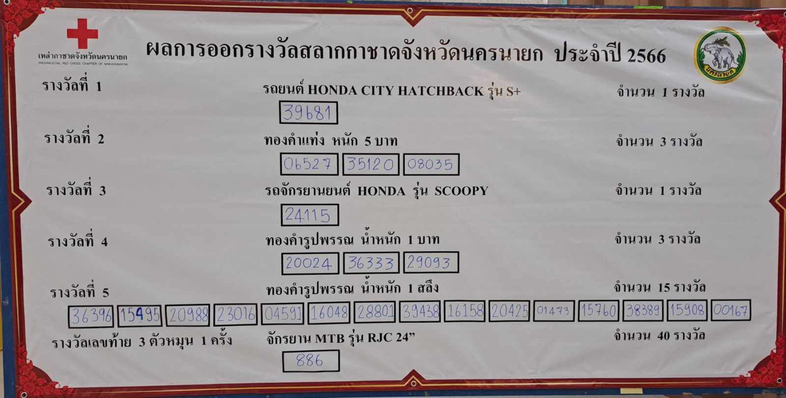 โดยมีรางวัลสลากกาชาดรวม 63 รางวัล ประกอบด้วย รางวัลที่ 1 รถยนต์ HONDA CITY HATCHBACK รุ่น S+ จำนวน 1 รางวัล รางวัลที่ 2 ทองคำแท่ง น้ำหนัก 5 บาท จำนวน 3 รางวัล รางวัลที่ 3 รถจักรยานยนต์ HONDA รุ่น SCOOPY จำนวน 1 รางวัล รางวัลที่ 4 ทองคำรูปพรรณ น้ำหนัก 1 บาท จำนวน 3 รางวัล รางวัลที่ 5 ทองคำรูปพรรณ น้ำหนัก 1 สลึง จำนวน 15 รางวัล รางวัลเลขท้าย 3 ตัว หมุน 1 ครั้ง รถจักรยาน MTB รุ่น RJC 24 จำนวน 40 รางวัล ซึ่งการออกสลากกาชาดจังหวัดนครนายก ประจำปี 2566 ในครั้งนี้ ได้รับความร่วมมือจากหัวหน้าส่วนราชการ ทุกส่วนราชการ ผู้บริหารองค์กรปกครองส่วนท้องถิ่นทุกแห่ง หัวหน้าหน่วยงานรัฐวิสาหกิจทุกแห่ง ภาคเอกชนในพื้นที่จังหวัดนครนายก ประชาชนชาวจังหวัดนครนายก กํานัน ผู้ใหญ่บ้าน ทุกคน ที่มีส่วนร่วมในกิจกรรมในครั้งนี้บรรลุผลเป็นไปด้วยความเรียบร้อย เหล่ากาชาดจังหวัดนครนายก ขอขอบคุณไว้ ณ โอกาสนี้