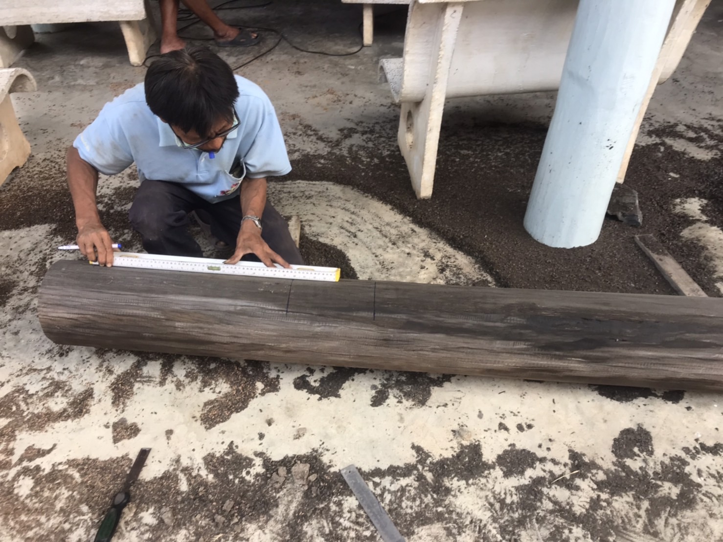 โดยพบว่าเสายังคงมีสภาพดีอยู่และเนื้อไม้ยังคงอยู่ในสภาพสมบูรณ์ เต็มแน่นไปทั้งลำต้น โดยที่ยังไม่พบร่องรอยของการผุกร่อนเลย จึงอาจทำให้มีน้ำหนักมากจนยกไม่ขึ้น โดยหลังจากวัดความยาวแล้ว มีความยาวตลอดลำต้น 718 ซม. หรือประมาณ 7 เมตร 18 ซม. ซึ่งทางช่างไม้บอกว่าเป็นไม้เต็ง ซึ่งตนเองก็ยังไม่เคยเห็นความยาวจริงของเสาไม้ต้นนี้มาก่อน เพราะเกิดมาไม่ทันตอนที่ปู่และย่าใช้งานกังหันวิดน้ำเข้านา