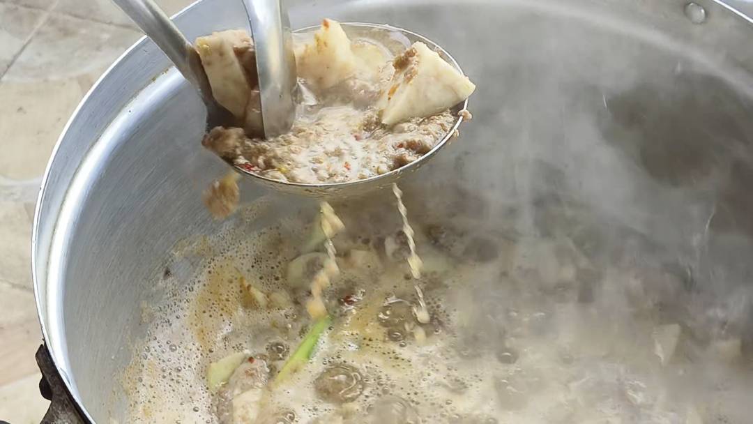 จากนั้นตักออกจากครกมากรองเอาแต่น้ำปู แล้วเอาเศษปูทิ้ง ต่อมานำน้ำปูที่ได้ มาตั้งบนเตาไฟ จนน้ำเริ่มเดือด แล้วใส่เผือกหรือมะละกอ หั่นเป็นชิ้นๆ ใส่ลงไปในหม้อ ตามด้วยข่า ตะไคร้ แล้วเทมันปูที่ได้ขูดออกจากกระดองลงไป ตามด้วยพริกแห้งตำละเอียด จากนั้นคนให้เข้ากัน แล้วเริ่มขั้นตอนการปรุงรส ใส่ผงชูรส ข้าวคั่ว หัวหอม ปลาร้าต้มสุก ใบมะขามอ่อน ผักแขยง เพื่อเพิ่มกลิ่นและรสชาติ จะมีกลิ่นหอมโชย เมื่อสุกได้ที่แล้ว จากนั้นก็ตักเสิร์ฟพร้อมชิมกับข้าวสวยร้อนๆ ขอบอกเลยว่าอร่อยไม่รู้ลืมแน่นอน
