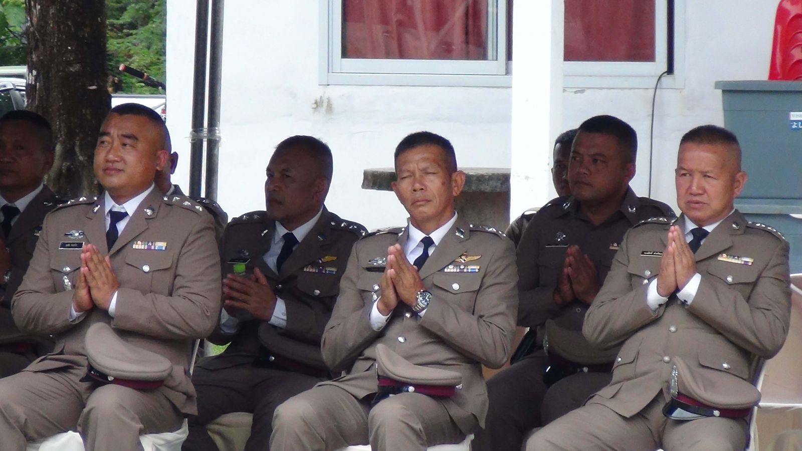 โดยในช่วงเช้าถวายภัตตาหารแด่พระสงฆ์ 9 รูป ในพิธี พระมหาเกษมณี เตชปญโญ เจ้าอาวาสวัดป่าวิเวก ประธานฝ่ายสงฆ์ พระสงฆ์เจริญพระพุทธมนต์เสร็จ ประเคน จตุปัจจัย เครื่องไทยธรรม พระสงฆ์อนุโมทนา กรวดน้ำ เสร็จพิธี ต่อมาประธานฝ่ายสงฆ์ ได้เจิมเหนือประตูทางเข้าอาคารที่ทำการสถานีตำรวจหว้านใหญ่ เพื่อความเป็นสิริมงคล