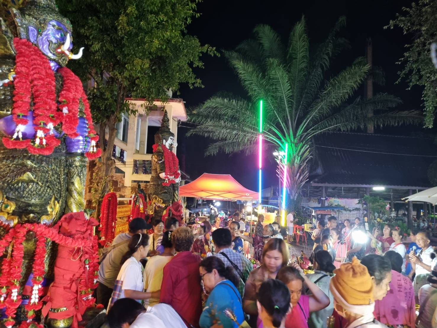 ช่วงเวลา 20.00 น. – 20.30 น. ได้มีฝนตกลงมา เหมือนพรมน้ำมนต์นานกว่า20นาที จึงเบาบางลง จากนั้นได้พร้อมใจจัดพิธีบวงสรวงในกลางดึก แม้ฝนโปรยปรายเป็นระยะๆ ผู้คนต่างไม่ถอยรอลุ้นเลขหางปะทัดในรายการสุดท้ายนำไปเสี่ยงดวงเลขเด็ดงวดนี้!