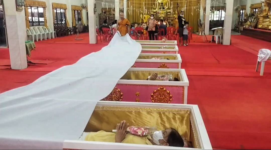 'วัดหลวงพ่อปากแดง'จัดพิธีนอนโลงศพ สะเดาะเคราะห์ต่อชะตาฝึกตายก่อนตาย