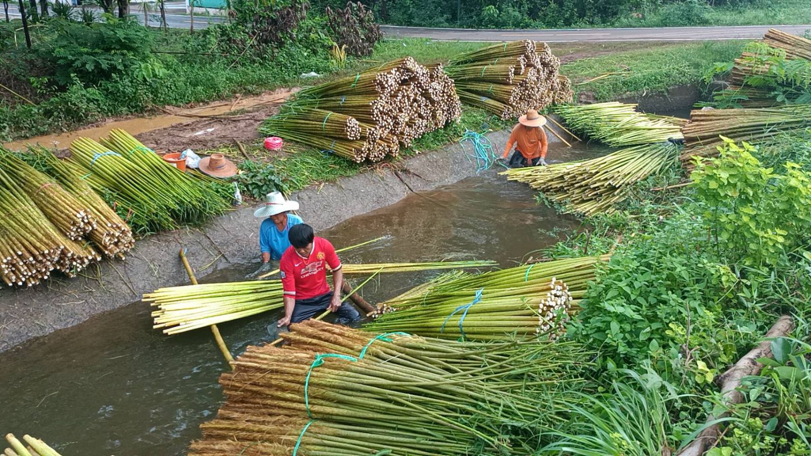 หลังจากตัดมากองไว้แล้วจะตัดปลายยอดทิ้งแล้วโยนลงคลอง ซึ่งจะมีคนงานคอยล้างทำความสะอาด โดยใช้ถุงมือในล่อนถูรากที่ติดกับรอบลำต้นออกให้หมดซึ่งใช้เวลาล้าง 20 วินาทีต่อต้น แล้วกองรวมกันผึ่งตากแดดราว 10 นาทีจะใช้เชือกมัดเป็นมัดๆ1 มัด มี 50 ต้น จ้างแรงงานล้างร้อย20-30 บาท