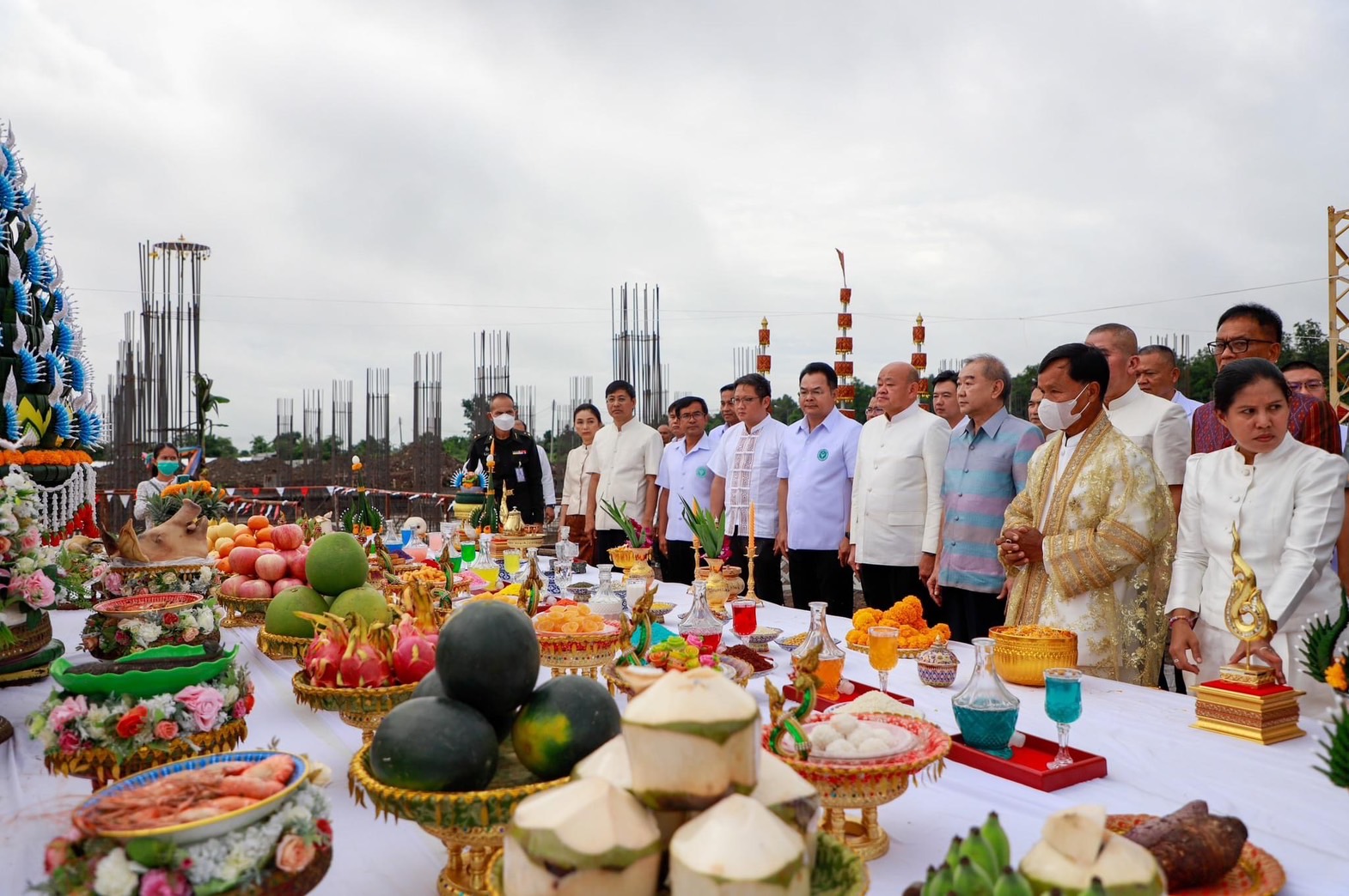 โดยภายในพิธีผู้ว่าราชการจังหวัดบุรีรัมย์ ได้นำทุกภาคส่วนเข้าร่วมประกอบพิธีพราหมณ์ บวงสรวงเทพยดา สิ่งศักดิ์สิทธิ์ เพื่อความเป็นสิริมงคล โดยได้จุดธูปเทียนเครื่องบวงสรวง รินน้ำอมฤทธิ์ โปรยข้าวตอกดอกไม้ ก่อนเข้าสู่พิธีเจริญพระพุทธมนต์ พร้อมวางศิลาฤกษ์ พิธียกเสาเอกเสาโท และพิธีถวายจตุปัจจัยไทยธรรม โดยมี พระธรรมวชิรสุตาภรณ์ เจ้าคณะจังหวัดบุรีรัมย์ พระราชพิศาลสุธี เจ้าคณะจังหวัดบุรีรัมย์(ธรรมยุต) และพระสงฆ์สมณศักดิ์ 10 เจริญพระพุทธมนต์