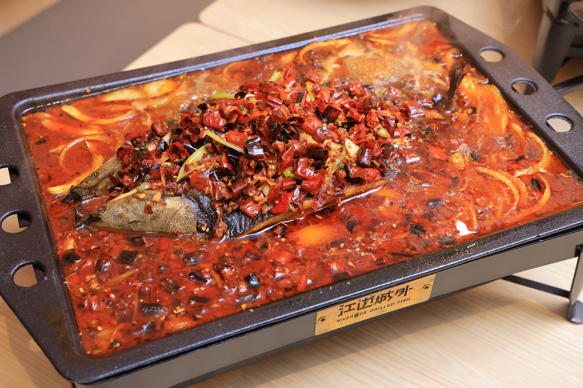 ·ปลาย่างกระทะร้อนสไตล์ฉงชิ่ง เมนูสำคัญประจำโอกาสพิเศษของคนจีน ปลาปาทีนเนื้อแน่น แล่ด้วยเทคนิคพิเศษ ให้เนื้อปลาสามารถเลาะก้างออกได้ง่าย นำไปย่างจนได้เนื้อในที่ชุ่มฉ่ำและหนังด้านนอกกรอบกำลังดี เสิร์ฟมาบนกระทะร้อน เสริมความอร่อยด้วยซอสทั้ง 5 ชนิด โดยขอแนะนำเป็นซอสหม่าล่า สูตรต้นตำรับจากเมืองฉงชิ่ง
