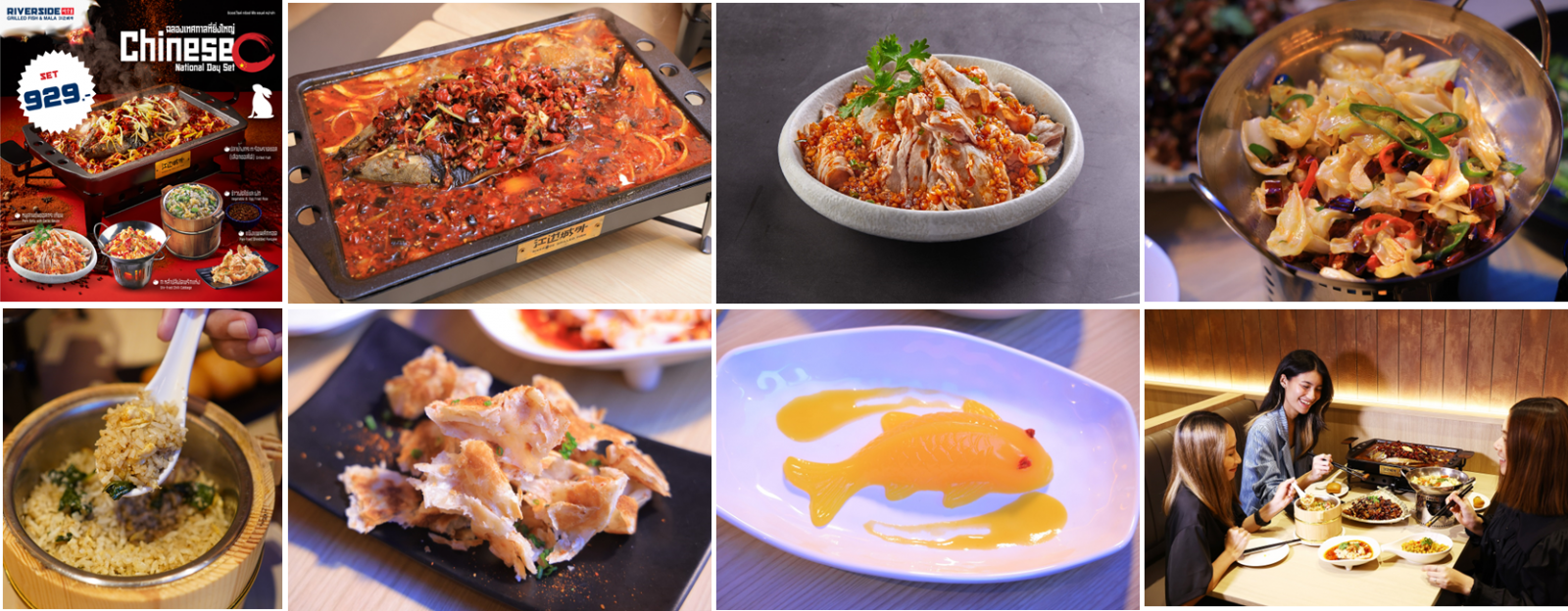 สำหรับใครที่อยากร่วมเฉลิมฉลองโอกาสอย่างวันไหว้พระจันทร์และวันชาติจีน หรืออยากสัมผัสประสบการณ์การรับประทานอาหารฟูลคอร์สช่วงเทศกาลพิเศษแบบคนจีนแท้ ๆ “ริเวอร์ไซด์ กริลล์ ฟิช แอนด์ หม่าล่า” ร้านอาหารจีนสไตล์ฉงชิ่ง-เสฉวนสูตรต้นตำรับชื่อดังจากแดนมังกร ได้จัดเซตเมนู “National Day Set” รวมทั้งเมนูปลาเสริมโชคและเมนูยอดประจำร้าน ให้ลูกค้าได้ลิ้มลองความอร่อยตามแบบฉบับฉงชิ่งพร้อมเสริมดวงรับความเฮงไปในตัว โดยในเซตประกอบไปด้วย