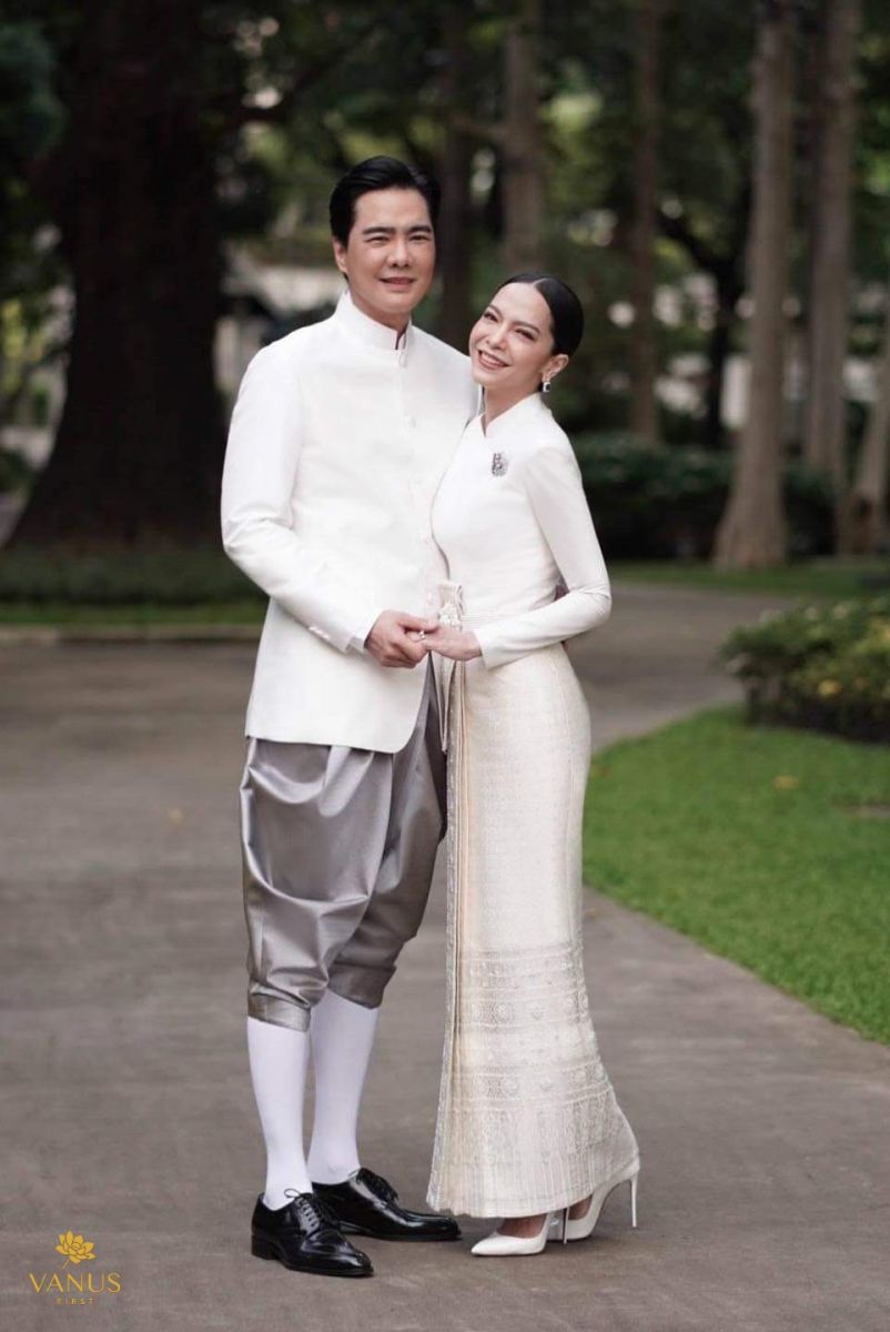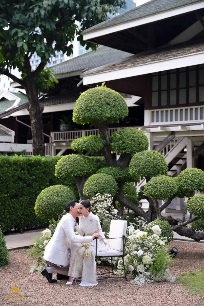 พิธีหมั้นในช่วงเช้าบ่าวสาวเปิดตัวมาในลุคชุดไทยที่ออกแบบและตัดเย็บโดยห้องเสื้อชุดแต่งงานสุดหรู “วนัช กูตูร์” เจ้าสาวมาในลุคชุดไทยบรมพิมานที่ตัดเย็บด้วยผ้าไหมยกดอกลำพูนสีขาวส่วนชุดไทยของเจ้าบ่าวนั้นเลือกใช้ผ้าไหมโคราชโทนสีขาวเทา ซึ่งทางห้องเสื้อได้ตัดเย็บชุดไทยทั้งสองชุดออกมาได้สวยงามและเรียบหรูสมกับเจ้าบ่าวและเจ้าสาวมากทีเดียว ส่วนชุดงานเลี้ยงเจ้าบ่าวมาในลุคชุดสูทสากลสีเทา ส่วนเจ้าสาวมาในลุคชุดแต่งงาน สีขาวทรงเมอเมด เว้าอกโชว์ความเซ็กซี่เบาๆ เป็นลุคเจ้าสาวที่ดูเรียบหรูและสวยงดงามมาก ๆ นับเป็นอีกหนึ่งคู่รักที่เหมาะสมกันดั่งกิ่งทองใบหยกขออวยพรให้ทั้งคู่ครองรักกันไปนานๆนะคะ และสำหรับใครที่ชื่นชอบชุดแต่งงานสไตล์เรียบหรูแบบนี้เข้าไปติดตามผลงานชุดแต่งงานแบบต่างๆได้ที่เพจของห้องเสื้อ วนัช กูตูร์ ได้เลยค่า