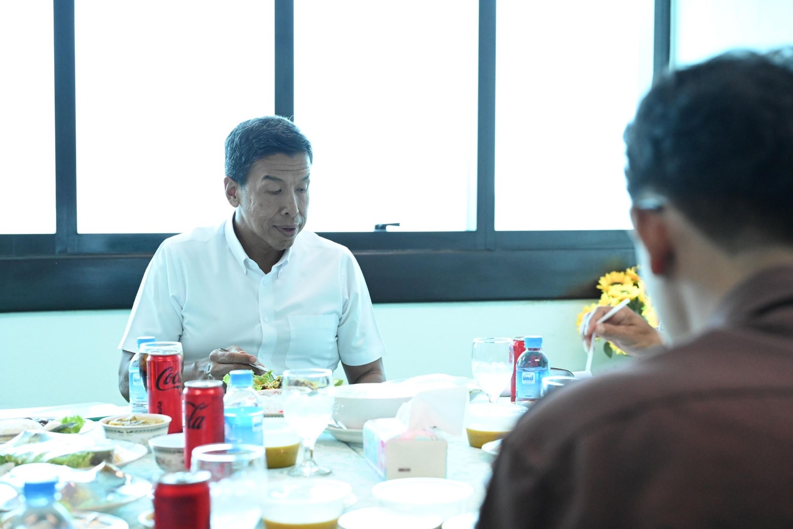 ภายหลังการประชุม ผู้ว่าฯ สัญจร ผู้ว่าฯ ชัชชาติ ได้ร่วมรับประทานอาหารกลางวันร่วมกับลูกจ้างประจำของสำนักงานเขต จำนวน 5 ราย ได้แก่ นายสมพงษ์ แก้วกำเนิด ลูกจ้างประจำ ตำแหน่ง พนักงานทั่วไป (เก็บขนมูลฝอย) นางสาวกัญญา มุ่งพึ่งกลาง ลูกจ้างประจำ ตำแหน่ง พนักงานทั่วไป (กวาด) นางสาวอุษา เกิดบริบูรณ์ ลูกจ้างชั่วคราว ตำแหน่ง พนักงานทั่วไป (กวาด) นางกนกพร พุ่มเจริญ ลูกจ้างประจำ ตำแหน่ง พนักงานสวนสาธารณะ นายศิริวัฒน์ ตะวงษา ลูกจ้างชั่วคราว พนักงานทั่วไป (ระบายน้ำ) สำหรับรายการอาหาร ประกอบด้วย แกงเขียวหวานหมู คั่วกลิ้งไก่ หมูทอดกระเทียม ผัดผักรวม ผลไม้แคนตาลูปแกงบวดฟักทอง ข้าวหมกไก่ (ข้าวบริยานี) โดยได้ร่วมพูดคุยสอบถามทั้งเรื่องส่วนตัว ชีวิตความเป็นอยู่ ปัญหาอุปสรรคในการทำงาน รับฟังข้อเสนอแนะต่างๆ ตลอดจนให้กำลังใจในการปฏิบัติหน้าที่ทำงานเพื่อประชาชน