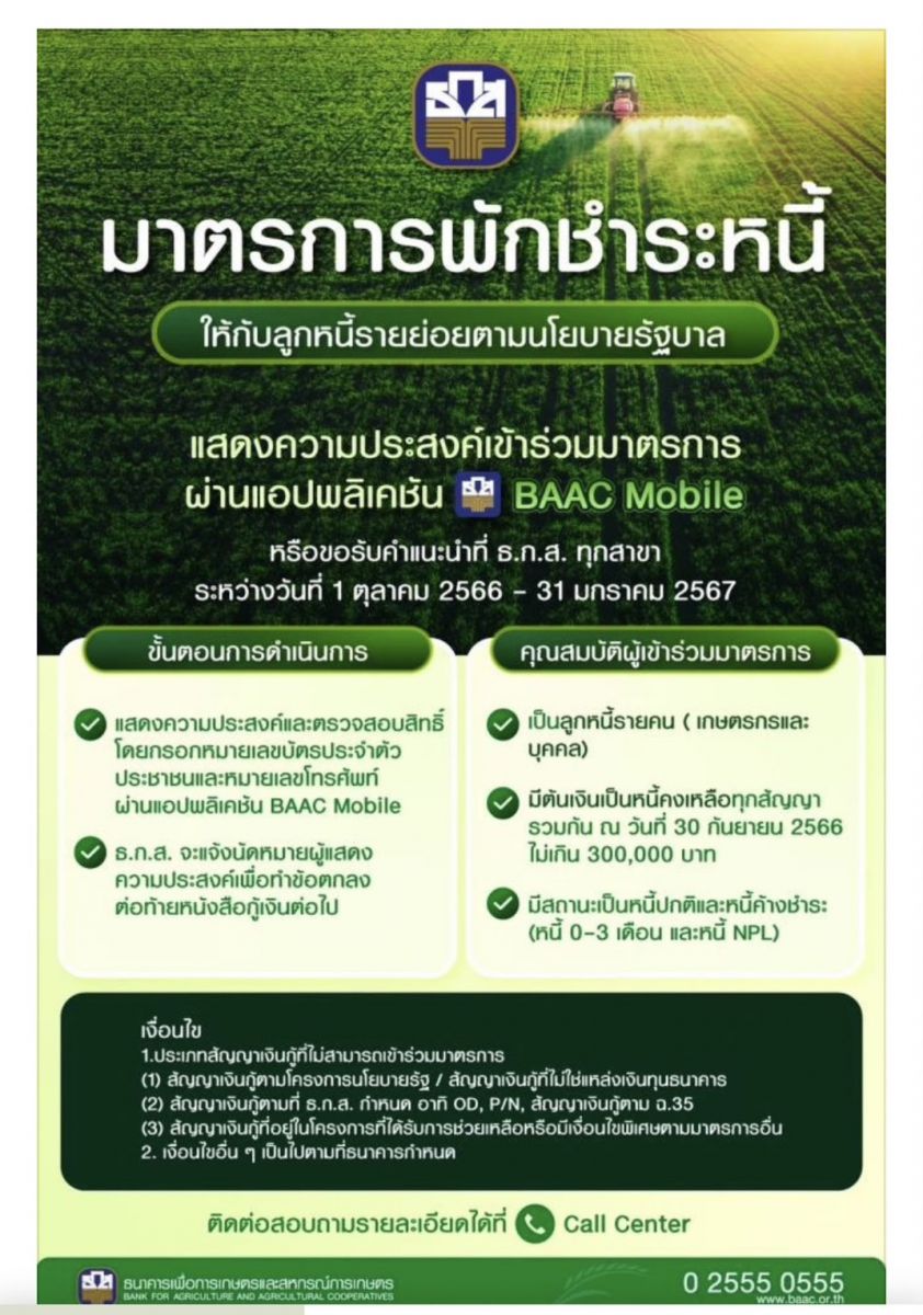 นายเชาวฤทธิ์ เกตุดี ผู้อำนวยการสำนักงาน ธ.ก.ส. จังหวัดกาฬสินธุ์ กล่าวว่า ตามที่คณะรัฐมนตรีได้มีมติเห็นชอบให้ ธ.ก.ส. ดำเนินมาตรการพักชำระหนี้ให้กับเกษตรกรและบุคคลที่มีสถานะเป็นหนี้ปกติ และหนี้ค้างชำระที่มีต้นเงินคงเป็นหนี้ทุกสัญญารวมกัน ณ 30 กันยายน 2566 ไม่เกิน 300,000 บาท ซึ่ง ธ.ก.ส. ได้เปิดระบบการแจ้งความประสงค์และตรวจสอบสิทธิ์ผ่านแอปพลิเคชัน BAAC Mobile ตั้งแต่วันนี้เป็นต้นไป เพียงกรอกหมายเลขบัตรประจำตัวประชาชนของผู้แสดงความประสงค์ พร้อมหมายเลขโทรศัพท์ที่สามารถติดต่อได้ จากนั้นระบบจะมีการประมวลข้อมูลตรวจสอบคุณสมบัติ เพื่อนัดหมายผู้ผ่านเกณฑ์และผู้ค้ำประกันไปที่สาขาหรือ จุดบริการที่นัดหมาย เพื่อจัดทำเอกสารที่เกี่ยวข้องเพื่อเข้ารับการประเมินศักยภาพและความสามารถในการชำระหนี้ รวมถึงการเสริมความรู้ฟื้นฟูทักษะในการประกอบอาชีพภายใต้แนวทาง “ตลาดนำ นวัตกรรมเสริม เพิ่มรายได้ใหม่”เพื่อให้มีรายได้ที่เพิ่มขึ้นหลังการพักชำระหนี้ พร้อมเตรียมผลิตภัณฑ์สินเชื่อที่เหมาะสมในการฟื้นฟูการประกอบอาชีพ วงเงินสูงสุดไม่เกิน 100,000 บาท ในการจัดหาปัจจัยการผลิต เพื่อให้เกษตรกรสามารถยืนได้อย่างมั่นคงหลังการพักชำระหนี้