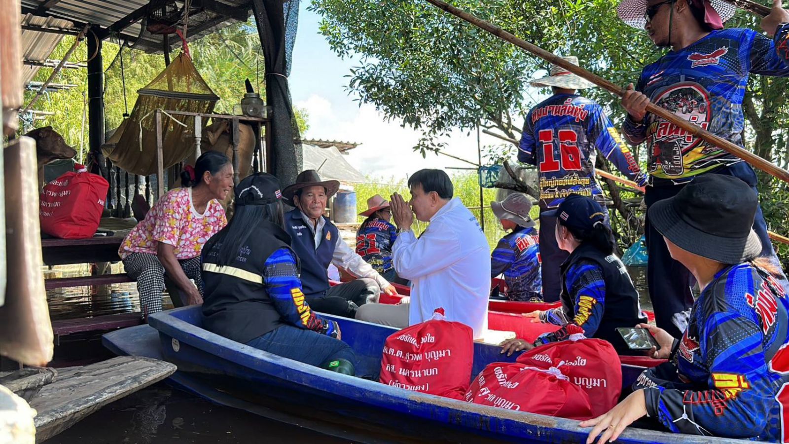 สส.นครนายกเขต1ลงเรือแจกถุงยังชีพ ช่วยชาวบ้านน้ำท่วมอำเภอปากพลี