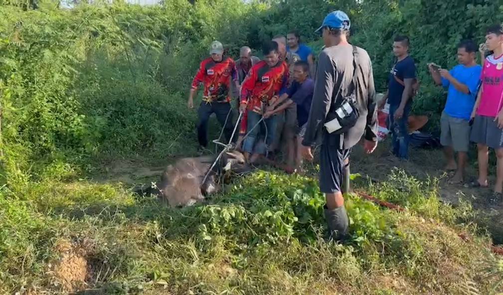 แห่ช่วยควาย'เจ้าสุข'กินเพลินจนตกบ่อ ชาวโพธิ์งาม-กู้ภัย-ปภ.งัดทุกวิธีช่วยได้ทัน