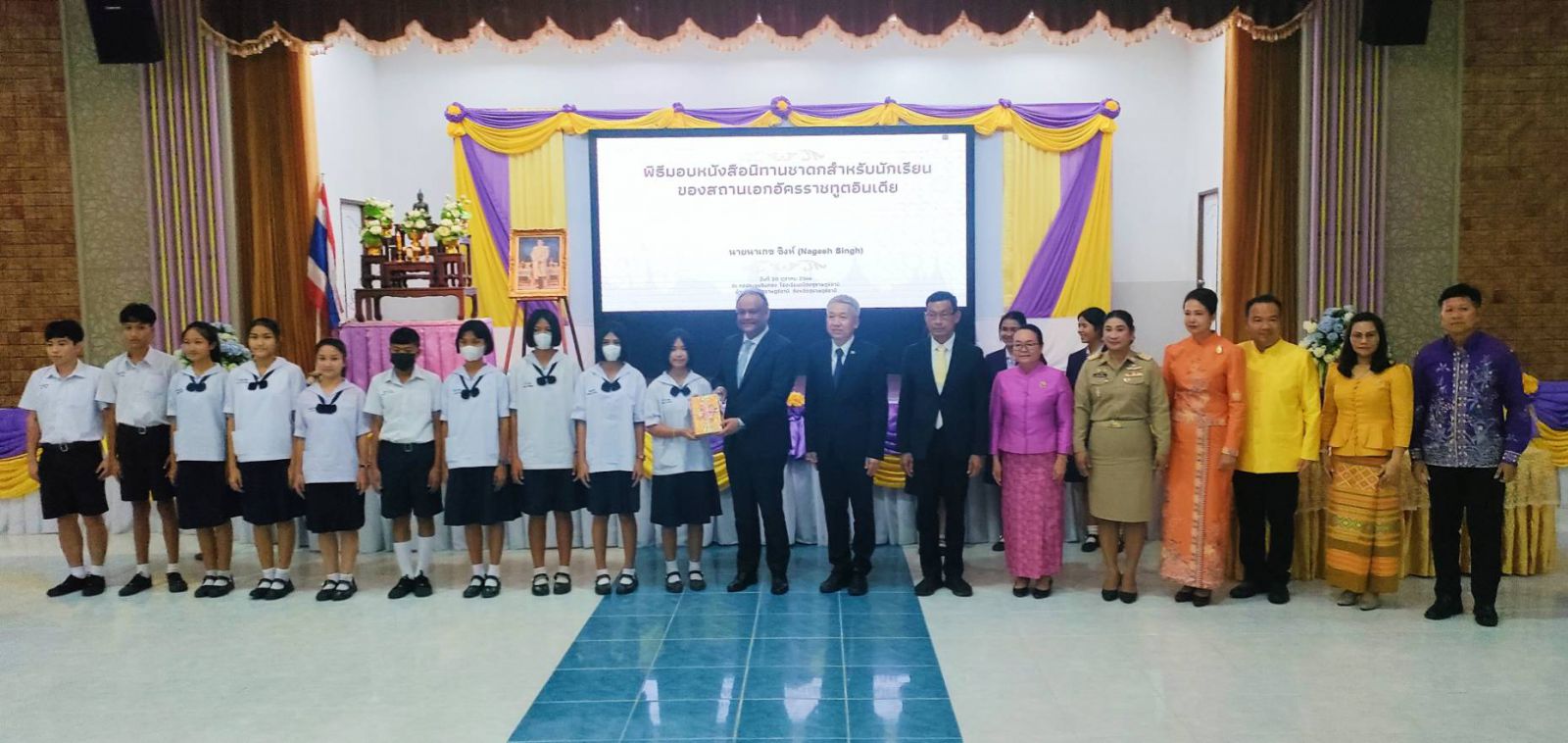 สุราษฏร์ธานี-วันที่ 30 ตุลาคม 2566 เวลา 15.00 น.สถานเอกอัครราชทูตอินเดีย ประจำราชอาณาจักรไทย จัดพิธีมอบหนังสือนิทานชาดก เพื่อให้เยาวชนไทยได้ทำความรู้จักกับชีวประวัติและคำสอนของพระพุทธเจ้า ปลูกฝังความเข้าใจในคุณธรรมของพระพุทธศาสนาและปลูกฝังพฤติกรรมอันดีมีคุณธรรม จำนวน 5,000 เล่ม สำหรับนักเรียนชั้นมัธยมศึกษาตอนต้นในจังหวัดสุราษฎร์ธานี