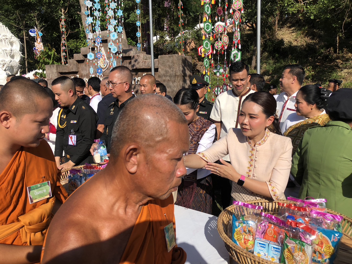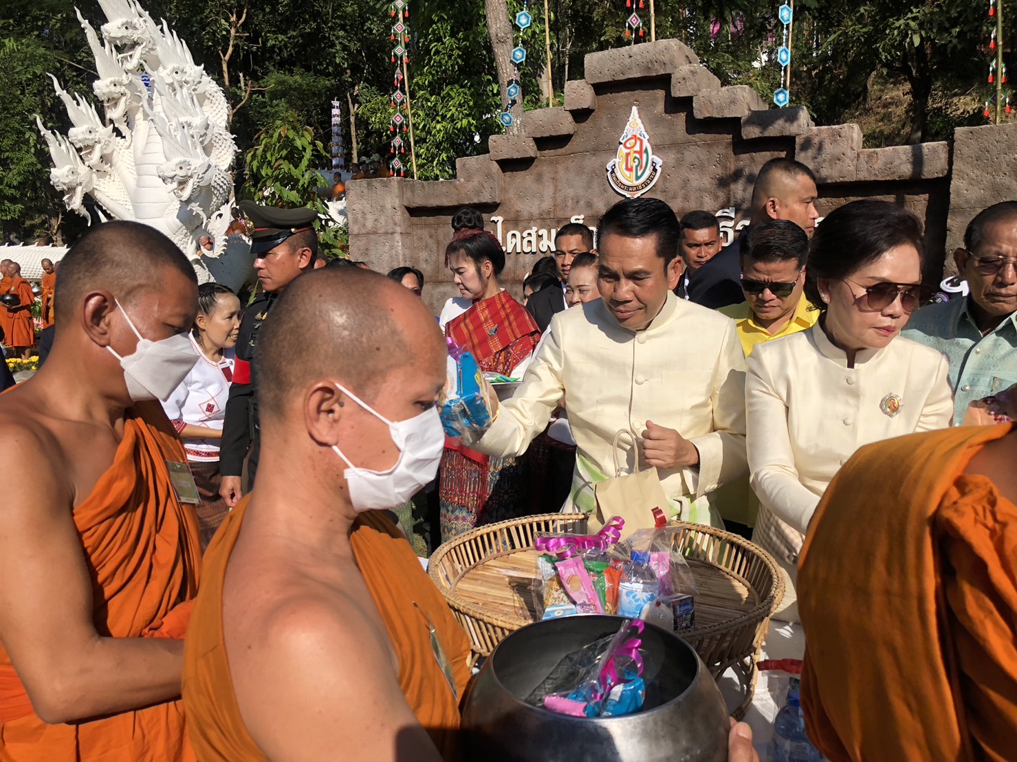 จากนั้นพระพรหมกวี กรรมการมหาเถรสมาคม เจ้าคณะภาค 3 เจ้าอาวาสวัดกัลยาณมิตร เป็นประธานฝ่ายสงฆ์ พระเมธีวัชราจารย์ เจ้าคณะจังหวัดกาฬสินธุ์ นำคณะสงฆ์เดินลงมาจากยอดเขาภูสิงห์ ลงมารับบิณฑบาตจากพุทธศาสนิกชนที่มาร่วมทำบุญตักบาตรในครั้งนี้ ซึ่งสิ่งของข้าวสารอาหารแห้ง ที่ได้รับจากการรับบิณฑบาต จะถูกส่งต่อให้กลุ่มเปราะบาง ช่วยผู้ประสบภัย ผู้ยากไร้ และศูนย์พัฒนาเด็กเล็กต่าง ๆ อีกด้วย