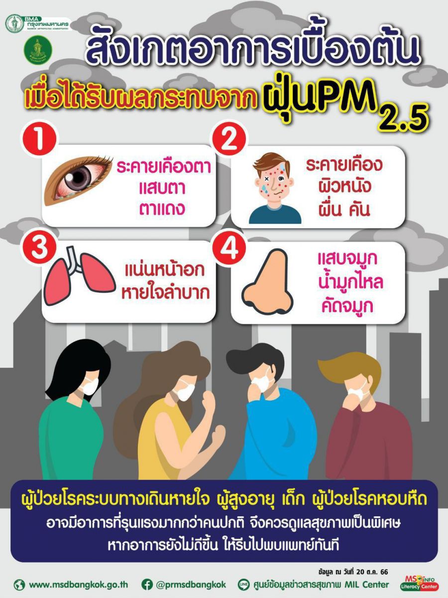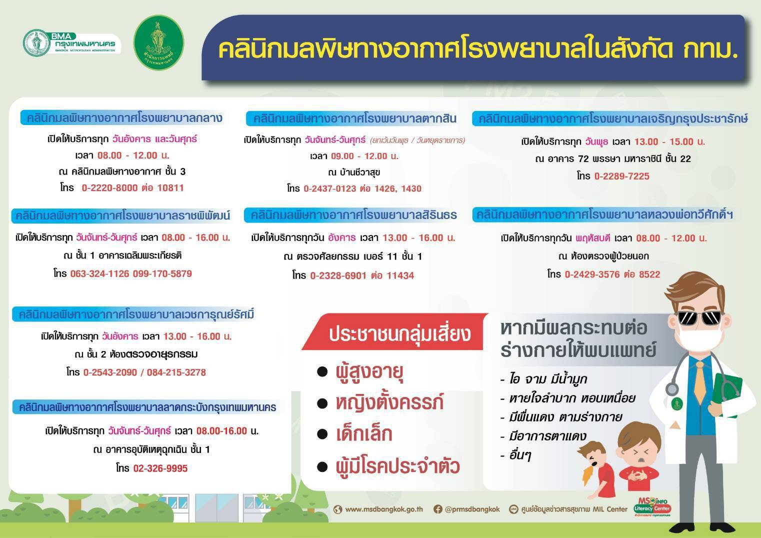 นอกจากนั้น สนพ.ได้ดำเนินมาตรการเชิงรุกร่วมกับภาคีเครือข่ายในพื้นที่ อาทิ สำนักงานเขต สถานีตำรวจนครบาล โรงเรียน ให้ความรู้ ข้อแนะนำแก่ประชาชนในพื้นที่โดยรอบ โดยบุคลากรทางการแพทย์และสาธารณสุขจะเน้นการเข้าถึงกลุ่มเปราะบางในพื้นที่ เพื่อให้คำแนะนำการดูแลสุขภาพ รวมถึงการสวมใส่หน้ากากอนามัยที่ถูกต้อง พร้อมแจกหน้ากากอนามัยให้กลุ่มเปราะบางในช่วงที่มีค่าฝุ่นสูง และรายงานสถิติผู้ป่วยที่ได้รับผลกระทบจากสถานการณ์ฝุ่น PM2.5 ติดตามสถานการณ์ฝุ่น PM2.5 เพื่อปฏิบัติการช่วยเหลือผู้ป่วยยามจำเป็น หากมีการรายงานค่าฝุ่นในพื้นที่ระดับเริ่มมีผลกระทบต่อสุขภาพ ขณะเดียวกันได้จัดทำสิ่งอำนวยความสะดวกและเตรียมพร้อมรองรับการให้บริการประชาชนในพื้นที่กรุงเทพฯ ที่ได้รับผลกระทบทางสุขภาพจากปัญหาฝุ่น PM2.5 โดยการเปิดศูนย์ปฏิบัติการการแพทย์ฉุกเฉินด้านสาธารณสุขกรณีฝุ่น PM2.5 เกิน 75 ไมโครกรัม/ลูกบาศก์เมตร (มคก./ลบ.ม.) และโรงพยาบาลในสังกัด กทม.เปิดคลินิกมลพิษทางอากาศ ได้แก่ รพ.กลาง โทร.02 220 8000 รพ.ตากสิน โทร.02 437 0123 รพ.เจริญกรุงประชารักษ์ โทร.02 289 7225 รพ.หลวงพ่อทวีศักดิ์ ชุตินฺธโร อุทิศ โทร.02 429 3576 รพ.เวชการุณย์รัศมิ์ โทร.02 543 2090 หรือ 084 215 3278 รพ.ลาดกระบังกรุงเทพมหานคร โทร.02 326 9995 รพ.ราชพิพัฒน์ โทร.063 324 11216 หรือโทร. 099 170 5879 และ รพ.สิรินธร โทร.02 328 6901 เพื่อให้คำปรึกษาแก่ประชาชนและให้บริการตรวจรักษาลดความรุนแรงของอาการที่เกิดจากฝุ่น PM2.5