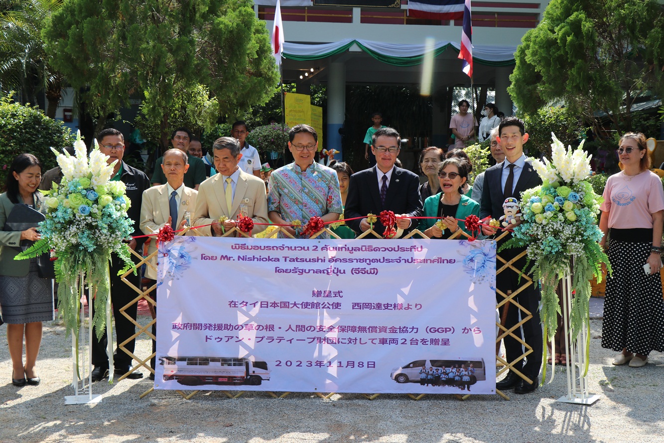 ผู้สื่อข่าวรายงานว่า เมื่อเวลา 13.30 น.ของวันที่ 8 พฤศจิกายน 2566 ณ โครงการเยาวชนหญิง สู่ชีวิตใหม่ ศูนย์กาญจนบุรี(มูลนิธิดวงประทีป) นายนิชิโอกะ ทัตสึชิ อัครราชทูตญี่ปุ่นประจำประเทศไทย เป็นประธานในพิธีมอบรถที่ได้รับบริจาค จากสถานทูตญี่ปุ่นประจำประเทศไทย โดยมี ร้อยโท ทศพล ไชยโกมินทร์ ผู้ว่าราชการจังหวัดกาญจนบุรี กล่าวต้อนรับฯ และคุณครูประทีป อึ้งทรงธรรม ฮาตะ ผู้ก่อตั้งเลขาธิการมูลนิธิดวงประทีป