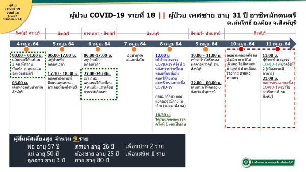 นายแพทย์จักราวุธ จุฑาสงฆ์ นายแพทย์สาธารณสุขจังหวัดสิงห์บุรี กล่าวเพิ่มเติมว่า ผู้ป่วยยืนยันรายที่ 18 นี้ ได้รับการยืนยันผล เมื่อคืนวันที่ 11 เม.ย..2564 เวลา 21.00 น. ซึ่งผู้ป่วยยืนยันรายนี้ เป็นผู้ที่เดินทางมาตรวจหาเชื้อด้วยตนเอง เพราะมีอาชีพเป็นนักดนตรีตามสถานบันเทิง ประกอบกับทราบว่าเพื่อนของเพื่อนนักดนตรีกลุ่มเดียวกันตรวจพบเชื้อโควิด-19 ซึ่งขณะนี้ผู้ป่วยพักรักษาตัวอยู่ที่โรงพยาบาลสิงห์บุรี โดยผู้ป่วยรายที่ 18 มี Timeline ดังนี้