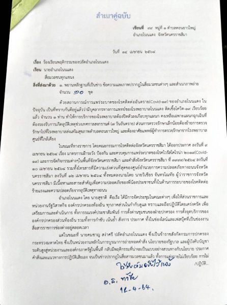ต่อมาเมื่อวันที่ 14 เมายน 64 นายสมจิตร พิศนอก ซึ่งตัวแทนชาวบ้านในอำเภอโนนแดง ได้ทำหนังสือร้องเรียนพฤติกรรมของปลัดอำเภอคนดังกล่าวกับนายสุชาติ ดือเร๊ะ นายอำเภอโนนแดง จังหวัดนครราชสีมา ว่าด้วยสถานการณ์การแพร่ระบาดของโรคติดต่ออันตราย (covid -19 ) ของอำเภอโนนแดง ในปัจจุบันเป็นที่ทราบกันดีอยู่ว่ามีบุคลากรทางกหารแพทย์ของโรงพยาบาลโนนแดง ติดเชื้อโควีด-19 เรียบร้อยแล้ว จำนวน 1 ราย ทำให้การบรารของโรงพยาบาลต้องปิดตัวลงเกือบทุกแผนก คงเหลือเฉพาะแผนกฉุกเฉินที่รองรับบริการการเกิดอุบัติเหตุในช่วงเทศกาลสงกรานต์ ( 7 วันอันตราย ) ส่วนการตรวจรักษาเล็กน้อยต้องย้ายการตรวจรักษาไปยังโรงพยาบาลส่งเสริมสุขภาพตำบลดอนยาวใหญ่ และต้องอาศัยแพทย์ผู้ทำการตรวจรักษาจากโรงพยาบาลศูนย์ใกล้เคียง