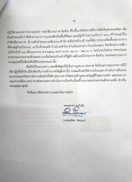 เมื่อคืนวันที่ 12 เมษายน 2564 เวลา 19.00-22.00 น. ของวันเวลาดังกล่าว โดยไม่สนใจต่อภาพพจน์และสายตาของประชาชนที่อาจจะลดความเชื่อถือต่อเจ้าหน้าที่ของรัฐได้ เสมือนหนึ่งประกาศ ข้อห้าม และคณะกรรมการควบคุมโรคมีไว้เพื่อบังคับใช้กับประชาชนเท่านั้น ดังนั้นในเรื่องนี้เพื่อมิให้เป็นแบบอย่างที่มิดีและเพื่อให้ดำรงถึงข้อกฎหมายและข้อบังคับของทางราชการ จึงอยากให้ทางนายอำเภอโนนแดง และนายวิเชียร จันทรโณทัย ผู้ว่าราชการจังหวัดนครราชสีมา ผู้บังคับบัญชาระดับสูงของจังหวัดนครราชสีมา ให้ดำเนินการตรวจสอบและสอบสวนข้อเท็จจริงที่เกิดของการทำงานของปลัดอำเภอดังกล่าว เพื่อพิสูจน์ว่ากฎหมาย ประกาศ ข้อห้ามต่างๆของราชการมีไว้เพื่อปฏิบัติได้จริง มิใช่เพื่อเป็นการสร้างภาพให้ดูดีเท่านั้น นายสมจิตร พิศนอก ตัวแทนของพี่น้องประชาชนชาวอำเภอโนนแดง กล่าวท้ายสุด
