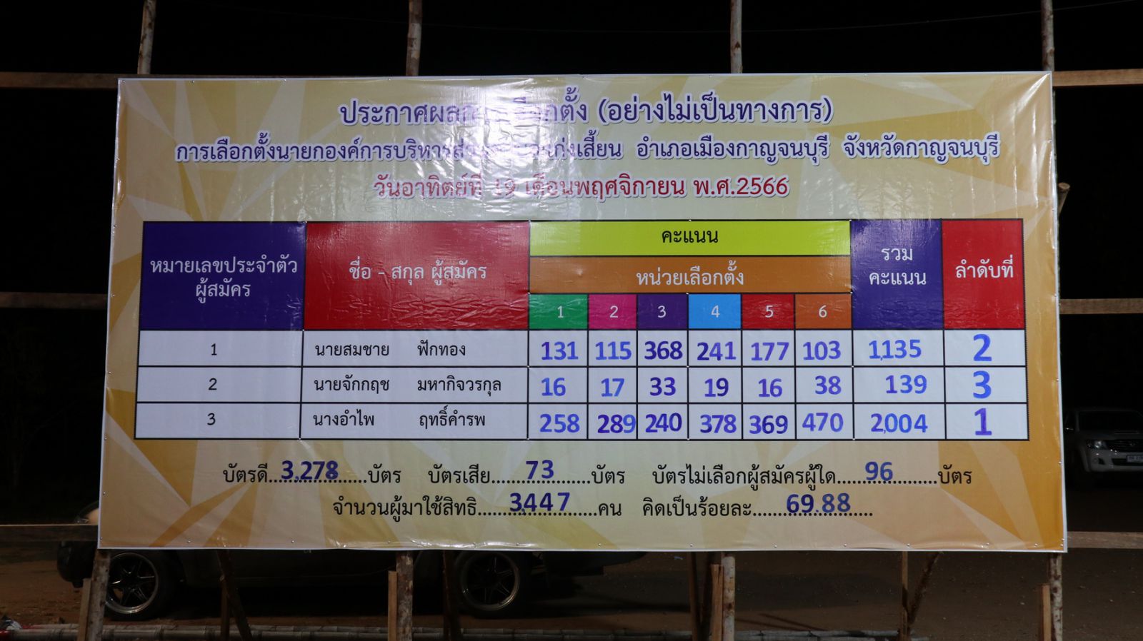 สำหรับผลคะแนนอย่างไม่เป็นทางการ มีดังนี้ นายสมชาย ฟักทอง ผู้สมัครคะก้าวหน้า เบอร์ หมายเลข 1 ได้ 1,135 คะแนน นายจักกฤช มหากิจวรกุล อดีตนายก อบต.แชมป์เก่า หมายเลข 2 ได้ 139 คะแนน นางอำไพ ฤทธิ์คำรพ หรือรองเอ๋ ที่ลงสมัครในนามทีมพลังกาญจน์ หมายเลข 3 ได้ 2,004 คะแนน รวมผู้มาใช้สิทธิเลือกตั้ง จำนวน 3,447 คน บัตรดี 3,278 บัตร คิดเป็นร้อยละ 69.88% บัตรเสีย 73 บัตร บัตรไม่เลือกผู้สมัครรายใด 96 บัตร