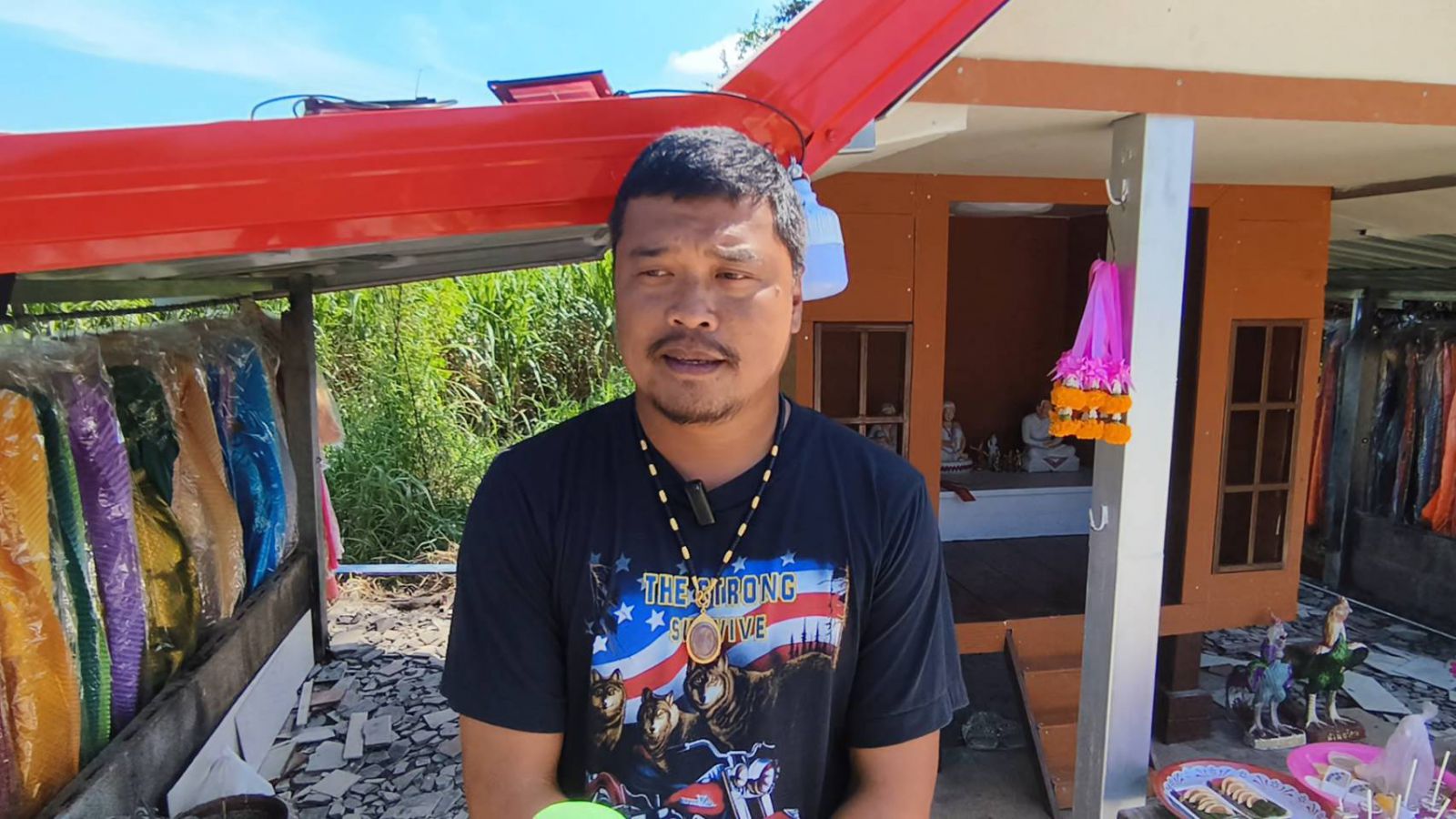 ส่วนเงินที่นำมาก่อสร้าง ตนได้รับเงินสมทบทุนจากการประกาศผ่านเฟสบุ๊คชื่อ "โจ๊ก แมคโคร" จนมีคนสนใจช่วยเงินสมทบทุนก่อสร้างมาจำนวนหนึ่ง ตนจึงนำรวบเงินทั้งของตนและที่ได้รับการสนับสนุน จัดซื้อวัสดุและอุปกรณ์ก่อสร้างศาลทันที โดยบางส่วนตนต้องจ่ายค่าแรงช่างที่เข้ามาดำเนินการก่อสร้างศาล ซึ่งได้ก่อสร้างศาลหลังใหม่มา 3 วันแล้ว วันนี้ช่างได้เข้ามาเก็บงานภายในศาลให้เรียบร้อย ส่วนบริเวณพื้นศาลตนต้องหาเงินอีกก้อน เพื่อเทปูนให้ศาลแล้วเสร็จสมบูรณ์เรีบร้อย