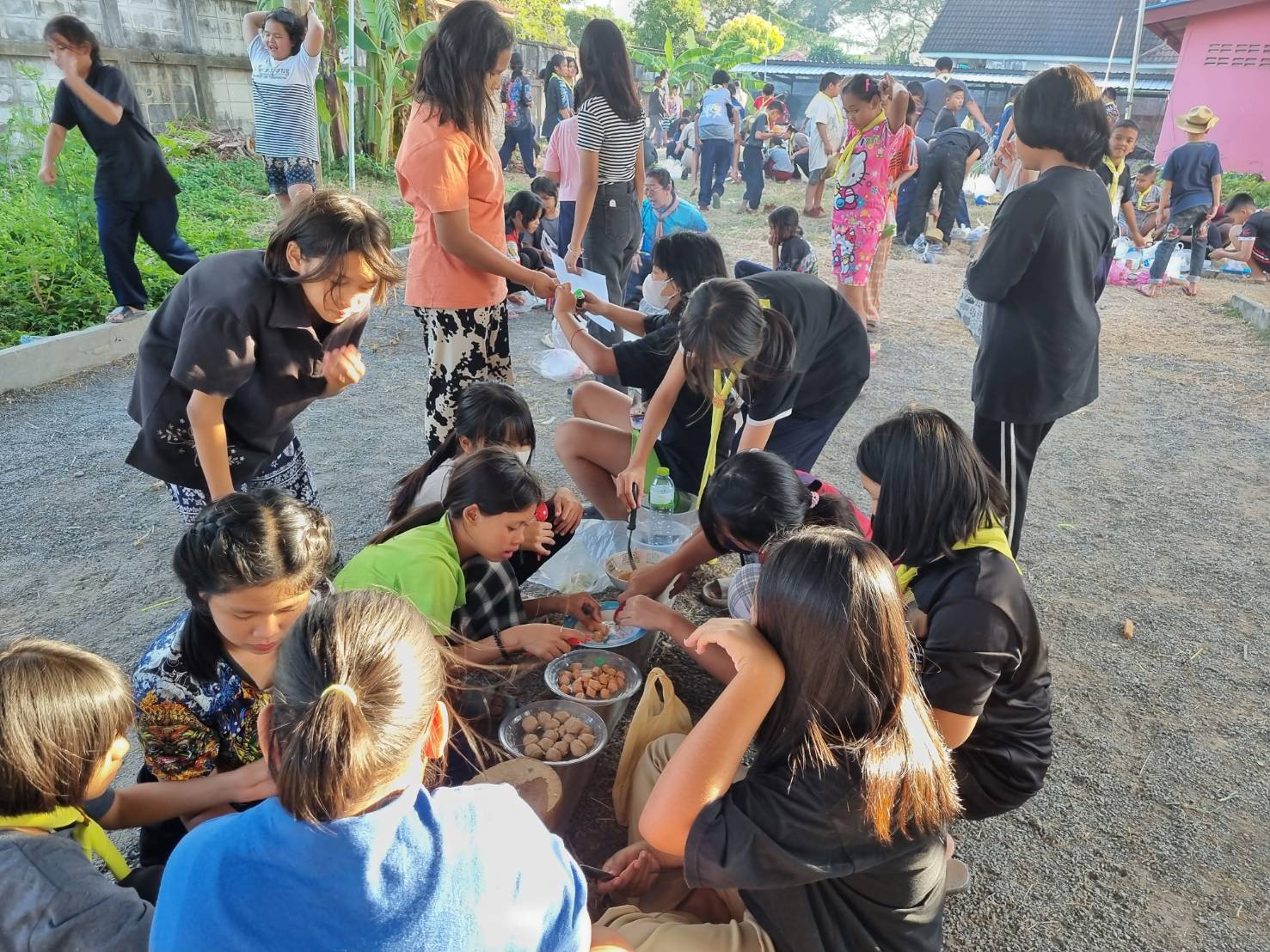 และ ให้ทุกคนล้อมวง โดยให้แขนขวาซ้อนบนแขนซ้ายของตนเอง และใช้มือขวาซ้ายจับคนข้างเคียงร่วมกันร้องเพลงสามัคคีชุมนุม พร้อมกับโยกตัวไปทางขวา ซ้าย ช้าๆจนจบเพลง พร้อมการนำสวดมนต์อย่างยาว จบแล้วให้สั่งให้ลูกเสือ –เนตรนารี ทุกคนหันหน้าไปยังทิศที่พระบาทสมเด็จพระเจ้าอยู่หัวประทับ หันหน้าไปยังพระบรมมหาราชวัง กรุงเทพมหานคร สั่งทำความเคารพแล้วนำร้องเพลงสรรเสริญพระบารมี จนจบ ท่ามกลางความสนุกสนานคลายเครียดของลูกเสือ – เนตรนารี