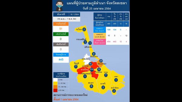 วันที่ 25 เม.ย. 64 ความคืบหน้าสถานการณ์โควิด 19 ที่ จ.สงขลา ในวันนี้พบผู้ป่วยติดเชื้อโควิด 51 คน รวมยอดสะสมเป็น 454 คน ซึ่งในจำนวนนี้ติดเชื้อมาจากต่างประเทศ (มาเลเซีย) 4 คน มีผู้เสียชีวิตไปแล้ว 1 คน และรักษาหายกลับบ้าน 10 คน รวมยอดผู้ป่วยที่ยังคงพักรักษาผู้ที่โรงพยาบาล และโรงพยาบาลสนาม จำนวน 443 คน เละมียอดรอตรวจหาเชื้ออีก 42 คน