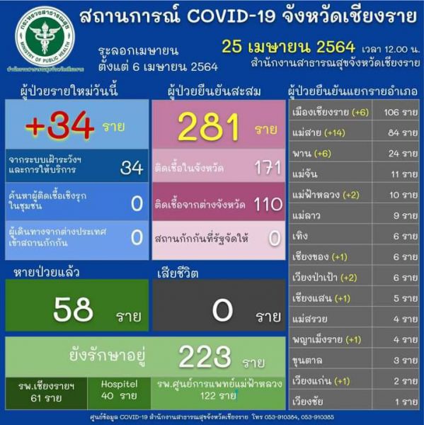 เมื่อวันที่ 25 เม.ย.64 โดย นายแพทย์วัชรพงษ์ คำหล้า สาธารณสุข จ.เชียงราย รายงานว่า วันนี้ จังหวัดเชียงราย มีผู้ติดเชื้อเพิ่ม 34 ราย ผู้ติดเชื้อสะสมรวม 281 ราย รักษาหายแล้ว 58 ราย และกำลังรักษา 223 ราย เป็นการติดเชื้อในจังหวัด 171 ราย ติดเชื้อจากต่างจังหวัด 110 ราย