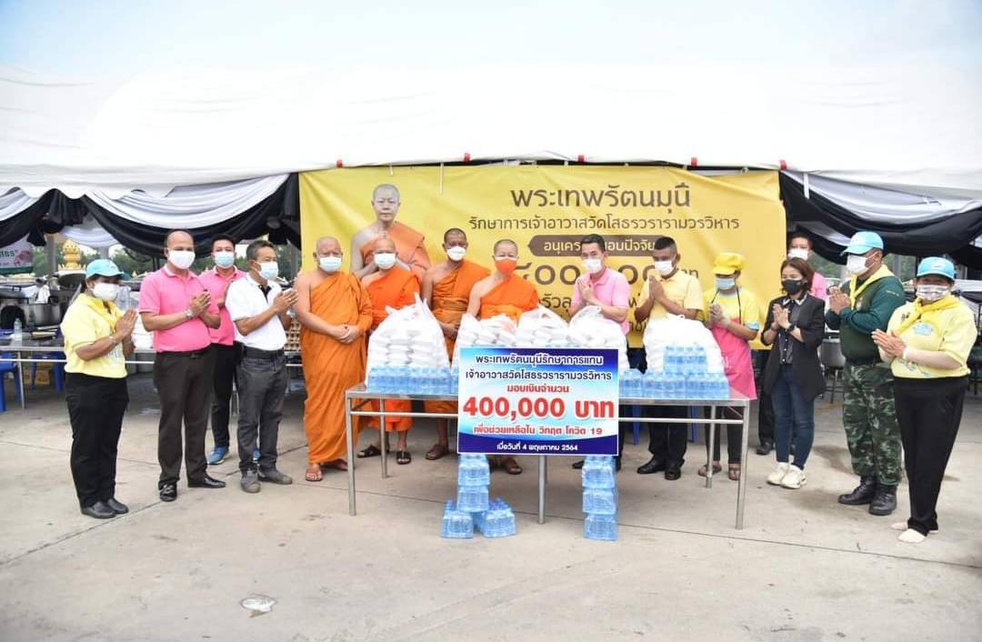พร้อมกันนี้ ผู้ว่าราชการจังหวัดฉะเชิงเทรา รับมอบเงินเพื่อสนับสนุนภารกิจโควิด-19 และโรงครัวลูกหลวงพ่อโสธร ห่วงใยช่วยผู้ประสบภัยโควิด จากพระเทพรัตนมุนี รักษาการเจ้าอาวาสวัดโสธรวรารามวรวิหาร โดยมอบเงิน จำนวน 400,000 บาท /ผู้บริหารโครงการจัดตั้งนิคมอุตสาหกรรมบลูเทคซิตี้ นำโดยนายสมโภชน์ อาหุนัย และนางสาวกุลพรภัสร์ วงศ์มาจารภิญญา มอบเงิน จำนวน 1,000,000 บาท (หนึ่งล้านบาท) พร้อมหม้อหุงข้าวขนาดใหญ่ 10 ลิตร จำนวน 10 หม้อ มูลค่า 50,000 บาท/นายรัฐสภา นพเกตุ รอง นายก อบจ.ฉะเชิงเทรา มอบน้ำดื่มให้วันละ 1,200 ขวด /บริษัท ซีพีเอฟ (ประเทศไทย) จำกัด มอบไข่ไก่ 17,000 ฟอง เนื้อหมู 600 กิโลกรัม และเนื้อไก่ 500 กิโลกรัม /ร้านจิระภา ไก่หมุน มอบน้ำดื่มขนาดเล็ก วันละ 6,000 ขวด /นายประโยชน์ โสรัจจกิจ อดีตประธานหอการค้าจังหวัด มอบเนื้อปลากระพง จำนวน 100 กิโลกรัม และในโอกาสเดียวกันนี้ ผู้ว่าราชการจังหวัดฉะเชิงเทรา โชว์ฝีมือประกอบอาหารบรรจุกล่องเพื่อแจกจ่ายให้พี่น้องประชาชนที่ได้รับความเดือดร้อนด้วย ทั้งนี้ ผู้ว่าราชการจังหวัดฯ ขอความร่วมมือพี่น้องประชาชน ปฏิบัติตามมาตรการป้องกันโรคโควิด-19 อย่างเคร่งครัด สวมหน้ากากอนามัย หรือหน้ากากผ้า ล้างมือบ่อย ๆ เว้นระยะห่าง ไม่เข้าไปในสถานที่แออัด ตรวจวัดอุณหภูมิร่างกาย อยู่บ้าน หยุดเชื้อ เพื่อครอบครัว และคนที่เรารักด้วย
