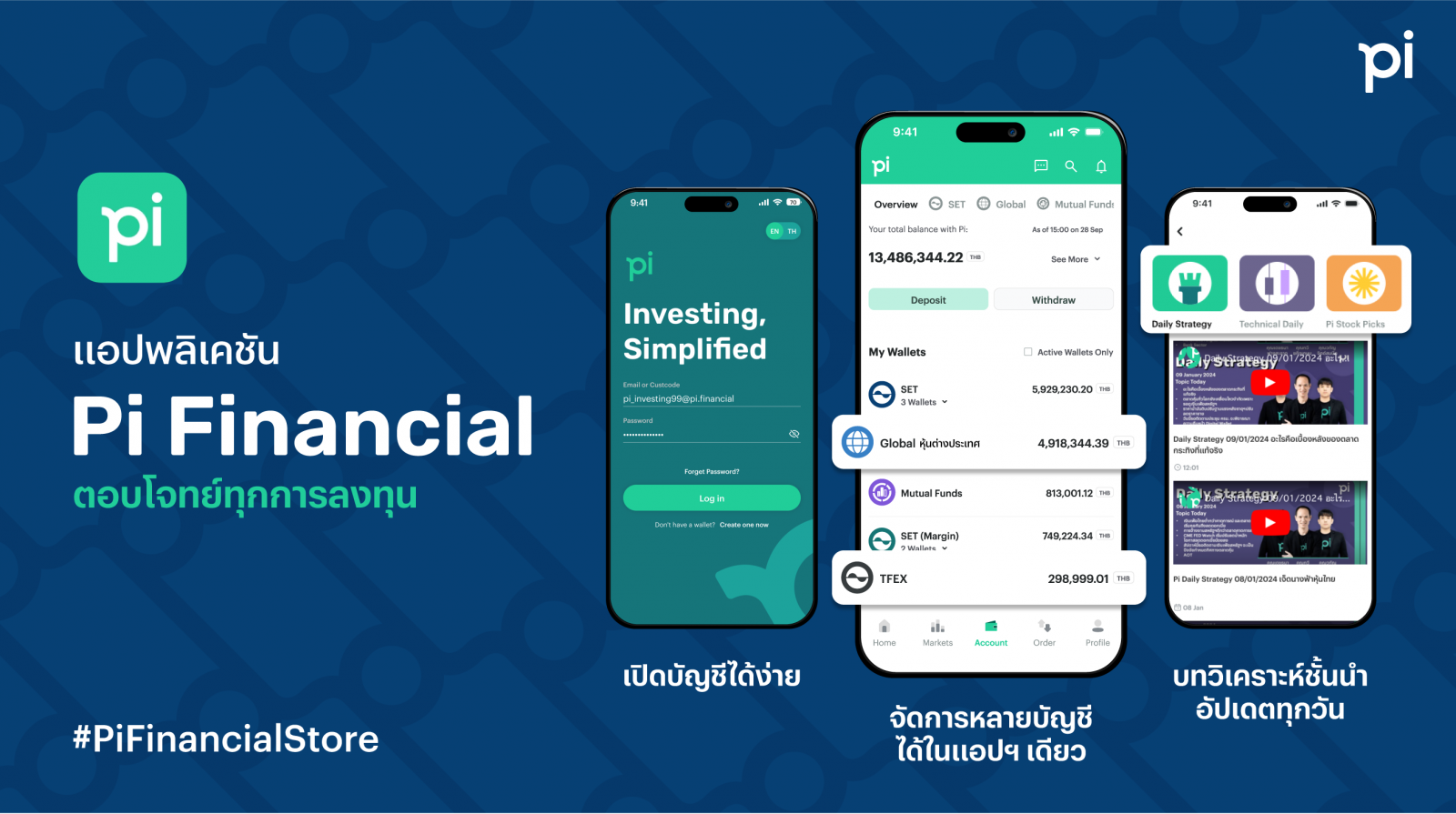 “Pi Financial มีความโดดเด่นที่การใช้งานง่าย ช่วยให้นักลงทุนสามารถทำธุรกรรมได้อย่างราบรื่น มีระบบการฝาก/ถอน/โอนเงินที่รวดเร็ว สามารถแลกเปลี่ยนสกุลเงินแบบเรียลไทม์ เพื่อซื้อขายหุ้นทั่วโลก สามารถวิเคราะห์สินทรัพย์ และเข้าถึงสินทรัพย์ที่หลากหลาย ทั้งการลงทุนในตลาดหุ้นไทย และตลาดหุ้นต่างประเทศ อนุพันธ์ไทย และเลือกกองทุนรวมที่เหมาะสมกับไลฟ์สไตล์และความเสี่ยงที่รับได้ของตน รวมถึงความสามารถในการดูราคาซื้อขายแบบเรียลไทม์ จึงทำให้สามารถหาจังหวะการซื้อขายที่ดีที่สุด หรือเรียกได้ว่าเทรดได้อย่างแม่นยำ รวมถึงการดูภาพรวมของสินทรัพย์ทั้งหมดได้แบบครบจบในที่เดียว จึงทำให้ง่ายต่อการจัดการ เราออกแบบแอปฯ นี้มา เพื่อให้ตอบรับกับความต้องการ และสามารถให้ผู้ใช้งาน ใช้งานได้อย่างง่ายดายที่สุด” คุณนิกันติ์ คุณกำจร ประธานเจ้าหน้าที่ฝ่ายเทคโนโลยี บริษัทหลักทรัพย์ พาย จำกัด (มหาชน) กล่าว