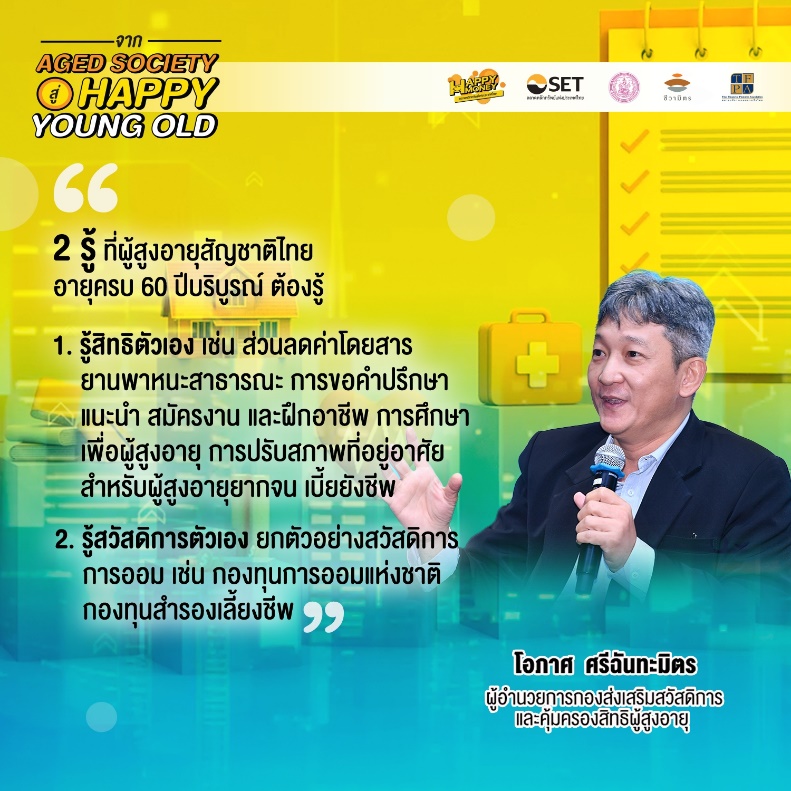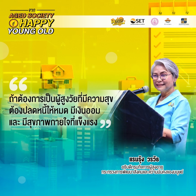 เปิดเวทีด้วยแรมรุ้ง วรวัธ อธิบดีกรมกิจการผู้สูงอายุ กระทรวงการพัฒนาสังคมและความมั่นคงของมนุษย์กล่าวว่าการเปลี่ยนแปลงโครงสร้างประชากรไทยสู่สังคมสูงอายุ ภาครัฐได้จัดนโยบายและโครงการต่างๆเช่น เบี้ยยังชีพผู้สูงอายุ บัตรสวัสดิการแห่งรัฐ สวัสดิการสำหรับผู้ที่ต้องการภาวะพึ่งพิงและผู้ดูแล และกำหนดนโยบายเพื่อเตรียมความพร้อมสำหรับคนสูงวัยคือ ทำให้ผู้สูงวัยมีสุขภาพที่ดี การเงินที่ดี เป็นกลุ่ม Active agingที่เข้าสังคมได้ เริ่มเตรียมความพร้อมด้านการเงิน เช่น การออมผ่านกองทุนการออมแห่งชาติ การให้ความรู้การออมตั้งแต่ยังไม่เกษียณ รวมถึงด้านเศรษฐกิจ เช่น การส่งเสริมให้มีงานทำหากยังสามารถทำงานได้ การปลดภาระหนี้สิน และการมีเงินออม เพื่อช่วยยกระดับคุณภาพชีวิตของผู้สูงอายุ ทั้งในเรื่องของสุขภาพทั้งร่างกาย จิตใจ และจิตวิญญาณนอกจากนี้ยังมีการบูรณาการหน่วยงานทุกองค์กรเพื่อรองรับผู้สูงอายุ เช่น ศูนย์พัฒนาคุณภาพชีวิต โรงเรียนผู้สูงอายุเพื่อให้ผู้สูงอายุได้มีการทำกิจกรรมร่วมกันการส่งเสริมด้านนวัตกรรมที่เหมาะสมกับผู้สูงอายุ เช่น การปรับสภาพแวดล้อมความเป็นอยู่อาทิ การสร้างบ้านที่เหมาะสมและปลอดภัยสำหรับผู้สูงอายุ การเพิ่มศักยภาพความรู้ด้านเทคโนโลยีออนไลน์เพื่อไม่ให้ถูกหลอกลวงจากมิจฉาชีพอีกด้วย