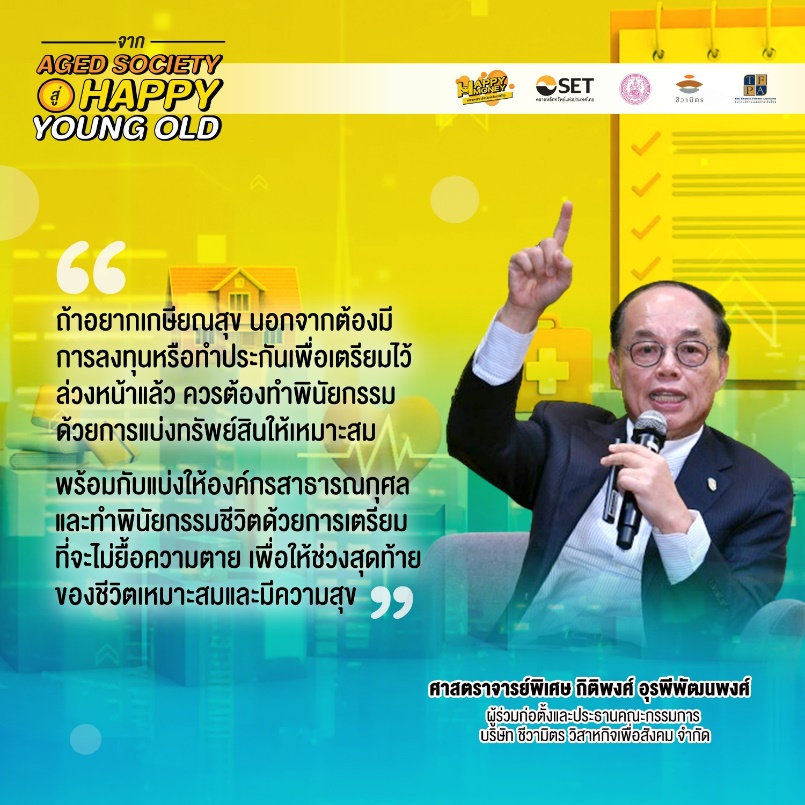 ศาสตราจารย์พิเศษ กิติพงศ์ อุรพีพัฒนพงศ์ผู้ร่วมก่อตั้งและประธานคณะกรรมการ บริษัท ชีวามิตร วิสาหกิจเพื่อสังคม จำกัดให้ความเห็นอีกแง่มุมที่น่าสนใจว่า การวางแผนชีวิตเกษียณสุขนั้นคือการเตรียมพร้อมก่อนที่จะเสียชีวิต ถ้าหากมีทรัพย์สินเพื่อไม่ให้เป็นภาระค่าใช้จ่ายในอนาคต สามารถนำมาขายเป็นเงินและนำไปลงทุนอย่างระมัดระวังเพื่อให้ได้ผลตอบแทนรวมถึงการทำพินัยกรรมซึ่งมี 2 อย่างคือ พินัยกรรมตามปกติเกี่ยวกับทรัพย์สินต่างๆ โดยจัดการทรัพย์สินให้ชัดเจน แบ่งทั้งลูกหลาน รวมถึงองค์กรการกุศล และพินัยกรรมชีวิตเป็นการเตรียมการที่จะไม่ยื้อความตายเพื่อให้เกิดค่าใช้จ่ายมากจนเกินไป และวางแผนให้ชีวิตจากไปอย่างมีคุณค่าและมีความสุข