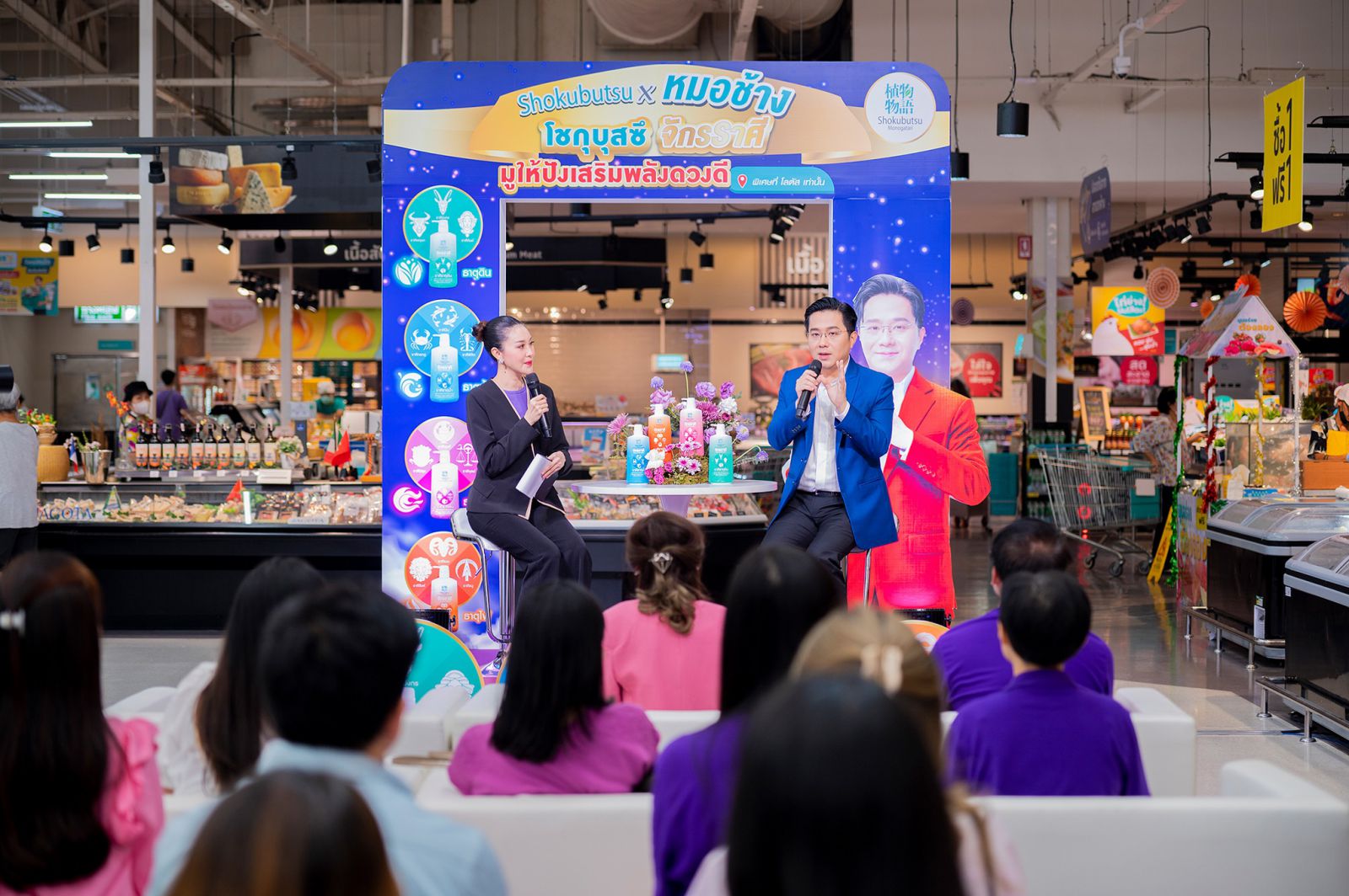 สำหรับบรรยากาศในงานถูกเนรมิตให้กลายเป็นพื้นที่แห่งความเชื่อ ในคอนเซ็ปต์ ‘มูให้ปังเสริมพลังดวงดี’ เพื่อให้ลูกค้าสายมูเข้ามาเสริมพลังดวงดี พร้อมเปิดรับความเฮงความปังกับกิจกรรมมากมาย ไม่ว่าจะเป็น เปิดดวงไปกับนักพยากรณ์, เปิดประตูบุญ สู่พระธาตุประจำปีเกิด และ เปิดโชครับคำทำนาย Shokubutsu Zodiac นอกจากนี้ ‘หมอช้าง – ทศพร ศรีตุลา’ ยังเผยทริคเสริมดวงชะตาให้เฮงปังอย่างมั่นใจด้วยว่า “หนึ่งในปัจจัยที่ทำให้มีความสุขคือ ช่วงเวลาในการอาบน้ำ ประกอบกับตามหลักฮวงจุ้ย น้ำเป็นสิ่งชำระล้างที่ดี ส่วนธาตุเป็นตัวบอกอารมณ์และความรู้สึกของคน โดยธาตุตามระบบสากล (Zodiac) มี 4 ธาตุ คือ ดิน น้ำ ลม ไฟ สำหรับปัจจัยที่จะกระตุ้นให้อารมณ์คนเปลี่ยนมีสองประการ คือ ‘สภาพแวดล้อม’ และ ‘กลิ่น’ เมื่อการอาบน้ำและกลิ่นหอมเป็นสองปัจจัยสำคัญในการสร้างความสุข ดังนั้น ถ้าอยากมีความสุข แนะนำให้อาบน้ำด้วยผลิตภัณฑ์ ‘โชกุบุสซึ จักรราศี’ ที่ผ่านการออกแบบมาให้มีกลิ่นหอมตรงตามระบบธาตุ โดยสามารถใช้ได้ทั้งครีมอาบน้ำตามธาตุของตัวเอง หรือครีมอาบน้ำของธาตุอื่นๆ ยกตัวอย่างเช่น หากต้องการปรับสมดุลก่อนนอน สามารถเลือกใช้ครีมอาบน้ำของธาตุน้ำ เพราะเป็นธาตุของการผ่อนคลาย หรือก่อนออกจากบ้าน อยากกระตุ้นความคิดสร้างสรรค์ก็สามารถเลือกใช้ครีมอาบน้ำของธาตุลมที่ตอบโจทย์ในเรื่องนี้ได้”