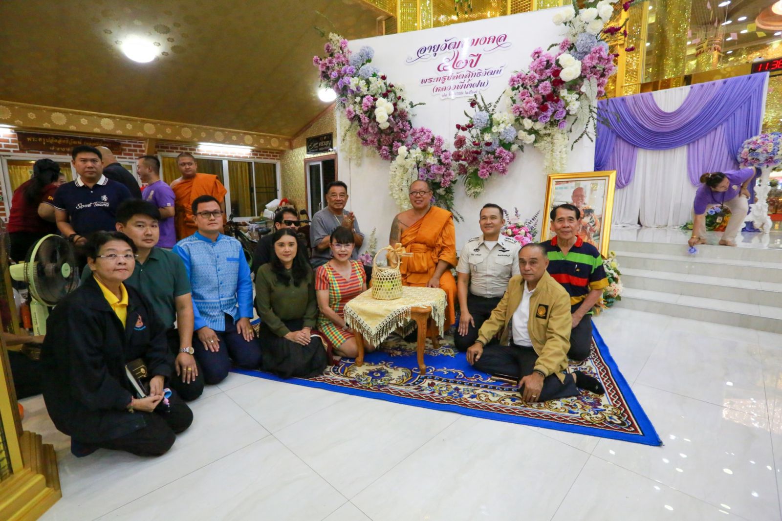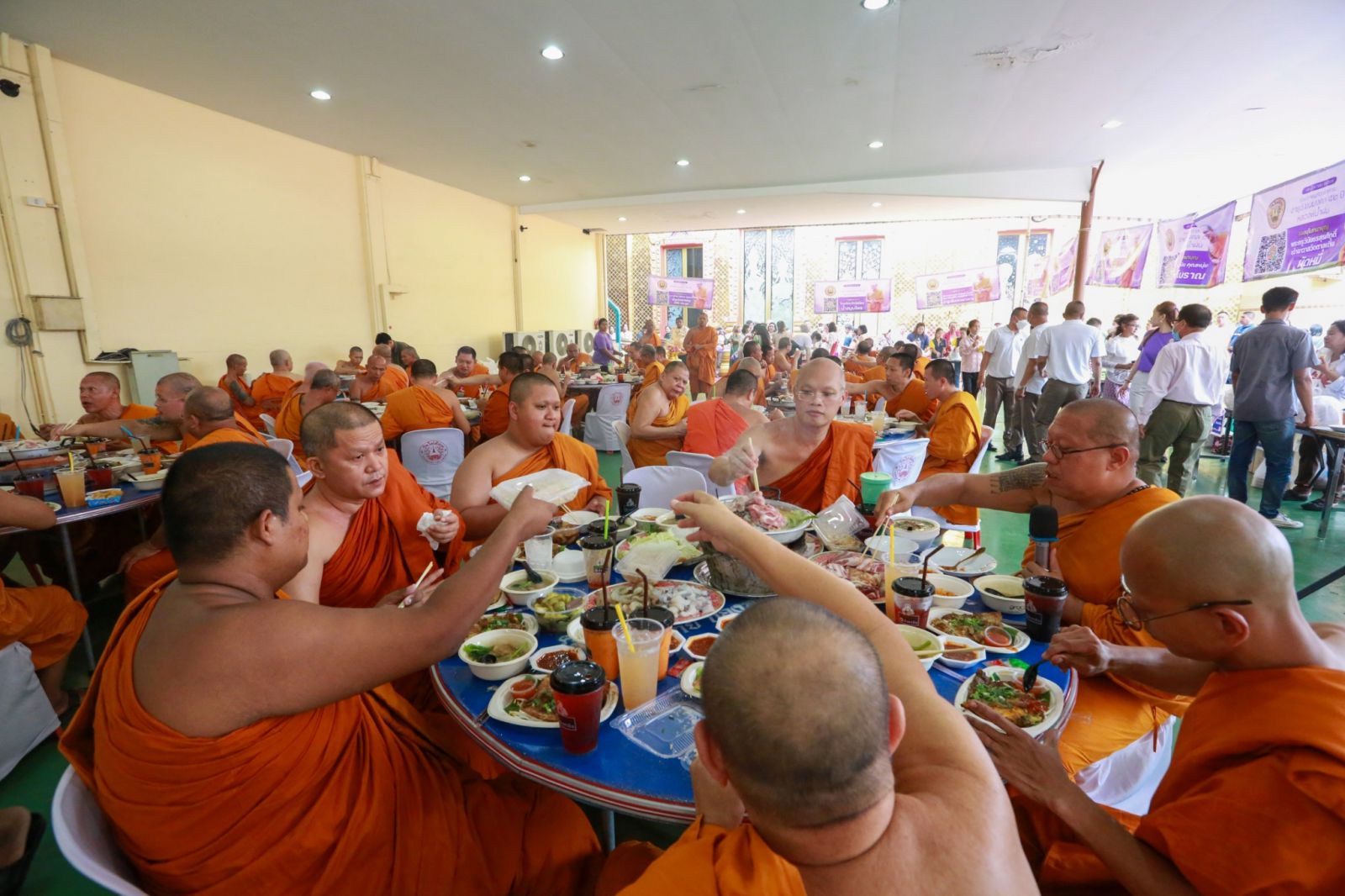 ต่อมา ได้มีการถวายภัตตาหารเพลให้กับคณะสงฆ์ 100 กว่ารูป และจัดให้มีการตั้งร้านแจก อาหารและเครื่องดื่มให้กับผู้เข้าร่วมงานได้ร่วมกันรับประทานฟรีตั้งแต่ช่วงเช้าจนถึงเที่ยง ซึ่งหลังจาก คณะสงฆ์ได้ฉันเพลเสร็จได้มีผู้ยากไร้เข้ามาต่อคิวรับประทานอาหารก้นบาตร เพื่อความเป็นสิริมงคลและประทังความหิวโดยเป็นหนึ่งกิจกรรมที่คณะสงฆ์และศิษยานุศิษย์ได้ร่วมกันจัดขึ้น โดยปรากฏว่ามีผู้เข้ามาร่วมรับประทานในโรงทานดังกล่าวหลายร้อยคน จนต้องมีการจัดระเบียบเพื่อความเรียบร้อยก่อนเสร็จพิธีทั้งหมดในช่วงเวลาเย็น