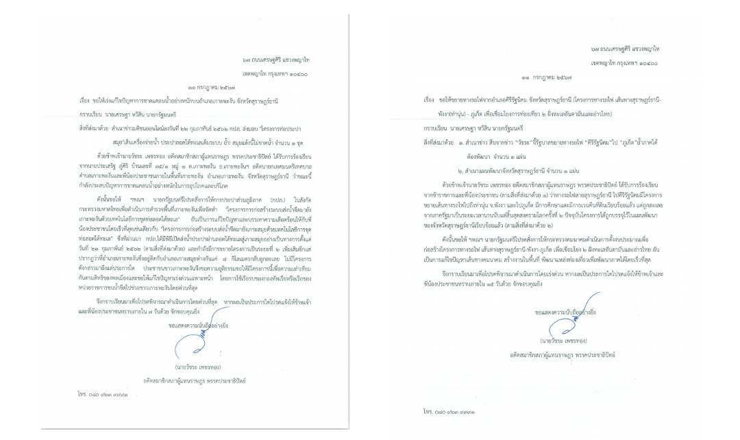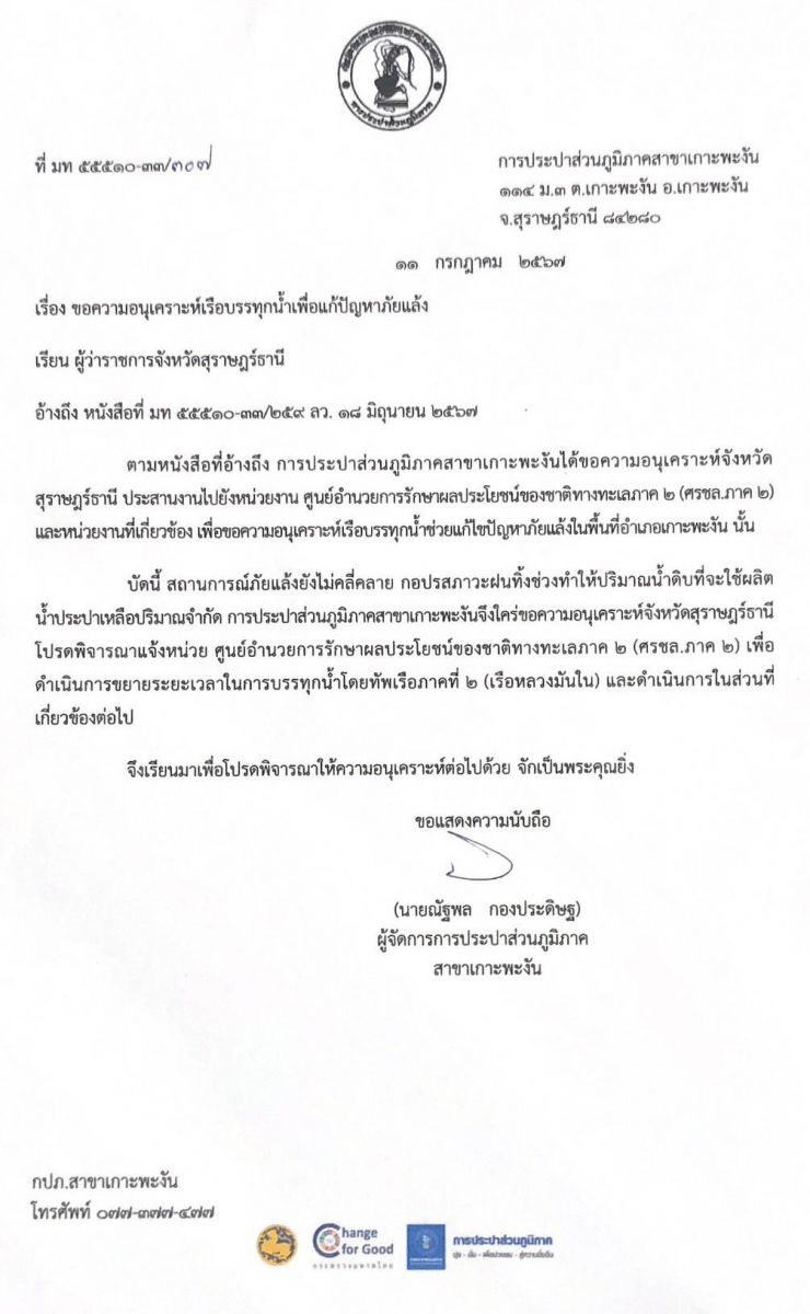 นายบุญเรือง หลงละลวด หัวหน้าสำนักงานป้องกันและบรรเทาสาธารณภัยจังหวัดสุราษฎร์ธานี เปิดเผยว่า จากกรณี ที่นายวัชระ เพชรทอง อดีต ส.ส.พรรคประชาธิปัตย์ จังหวัดสุราษฎร์ธานี ได้ยื่นหนังสือถึงนายเศรษฐา ทวีสิน นายกรัฐมนตรี ผ่านศูนย์รับเรื่องราวร้องทุกข์ของรัฐบาล 1111 จำนวน 2 เรื่อง โดยมีนายพันศักดิ์ เจริญ ผู้เชี่ยวชาญด้านมวลชน สำนักปลัดสำนักนายกรัฐมนตรี รับเรื่อง ซึ่งหนึ่งในนั้นคือ เรื่อง ขอให้เร่งแก้ไขปัญหาการขาดแคลนน้ำอย่างหนักบนอำเภอเกาะพะงัน จังหวัดสุราษฎร์ธานี ซึ่งนายวัชระ ระบุว่า ได้รับการร้องเรียน จากนายประเสริฐ ภูศิริ บ้านเลขที่ 35/1 หมู่ 1 ต.เกาะพะงัน อ.เกาะพะงันฯ อดีตนายกเทศมนตรีตำบลเกาะพะงัน และประชาชนในพื้นที่ ว่ากำลังประสบปัญหาการขาดแคลนน้ำอย่างหนักในการอุปโภคและบริโภค พร้อมกับ ขอให้ นายกรัฐมนตรีสั่งการให้การประปาส่วนภูมิภาค (กปภ.) ในสังกัด กระทรวงมหาดไทย เพื่อดำเนินการสำรวจพื้นที่เกาะพะงันเพื่อจัดทำ “โครงการการก่อสร้างระบบส่งน้ำจืดมายัง เกาะพะงันด้วยเทคโนโลยีการขุดท่อลอดใต้ทะเล” เช่นเดียวกับพื้นที่เกาะสมุย ที่เปิดใช้งานเมื่อปี 2562 และกำลังขยายโครงการระยะที่ 2 แต่ที่อำเภอเกาะพะงัน กลับไม่มี และยังได้ขอให้แก้ไขปัญหาเร่งด่วนเฉพาะหน้า โดยการใช้เรือรบของกองทัพเรือหรือเรือของหน่วยราชการขนน้ำจืดไปช่วยชาวเกาะพะงันโดยเร็วที่สุด