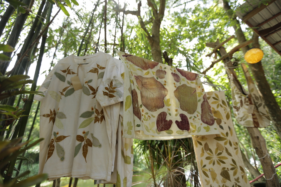 2) กลุ่มผลิตภัณฑ์ผ้าพิมพ์ลายใบไม้ GoodsLuKsi อ.ลานสกา ผ้า Eco Prints ผ้าพิมพ์ลายใบไม้จากผืนป่าหมู่บ้านคีรีวง ด้วยธรรมชาติที่อุดมสมบูรณ์พืชพรรณที่หลากหลายของผืนป่าบ้านคีรีวง เกิดเป็นแรงบัลดาลใจให้ชาวบ้านนำใบไม้จากสวนของตัวเองมาสร้างสรรค์งานศิลป์ผ่านบนลงผืนผ้า จนเกิดเป็นผลิตภัณฑ์ผ้า Eco Prints ที่มีลวดลายของใบไม้ที่หลากหลาย เช่น ลายใบยางพารา ลายลูกเนียง รวมถึงลายอื่นๆ ที่มาจากใบไม้ของป่าในชุมชนมากกว่า 40 ชนิด จากความอุดมสมบูรณ์ของผืนป่าส่งต่อมาเป็นผลิตภัณฑ์จากธรรมชาติ ทำให้ได้เห็นคุณค่าของธรรมชาติ ส่งผลให้คนในชุมชนรัก เข้าใจ และต้องการผลิตผลิตภัณฑ์ผ้า Eco Prints เปรียบเสมือนเครื่องบันทึกความทรงจำของทุกคนที่ได้มาเที่ยวที่บ้านคีรีวง จ.นครศรีธรรมราช และได้ซื้อผ้า Eco Prints กลับไป