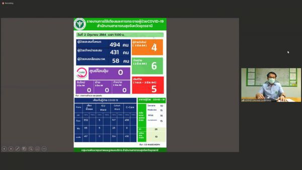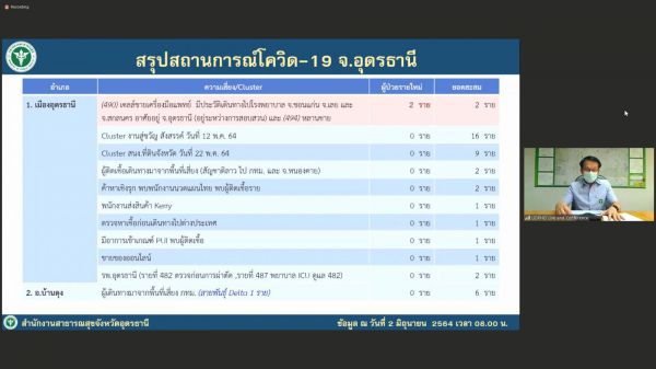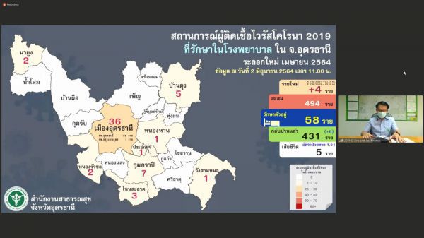 วันที่ 2 มิถุนายน 2564 เวลา 14.00 น.  นายอุเทน หาแก้ว รอง สสจ.อุดรธานี แถลงสถานการณ์โควิด จ.อุดรธานี ในการปฏิบัติเชิงรุกค้นหาผู้ติดเชื้อ แต่ไม่แสดงอาการรอบสอง ผ่านโปรแกรมซูมเพื่อเว้นระยะห่าง พบผู้ติดเชื้อเพิ่ม 4 ราย โดยตรวจพบจากเชิงรุกตลาดคลองถม อ.กุมภวาปี เป็นแม่ค้าขายถุงเท้า และเพื่อนอีก 2 ราย ซึ่งมีผู้สัมผัสเสี่ยงสูง 20 ราย ทำให้ผู้ติดเชื้อสะสม 491 ราย หายกลับบ้าน 431 ราย รักษาตัวอยู่ 58 ราย เสียชีวิตสะสม 5 ราย