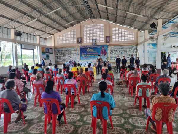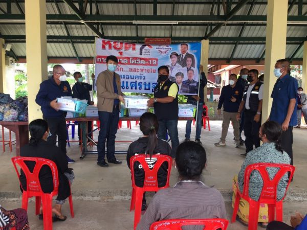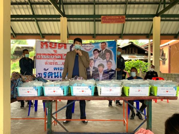 จากนั้นได้ร่วมมอบเครื่องอุปโภคบริโภคที่จำเป็นแก่ผู้นำหมู่บ้านเพื่อเป็นตัวแทนนำไปมอบให้กับประชาชนและผู้ที่ต้องกักตัวเป็นเวลา 14 วัน ในพื้นที่ดังนี้