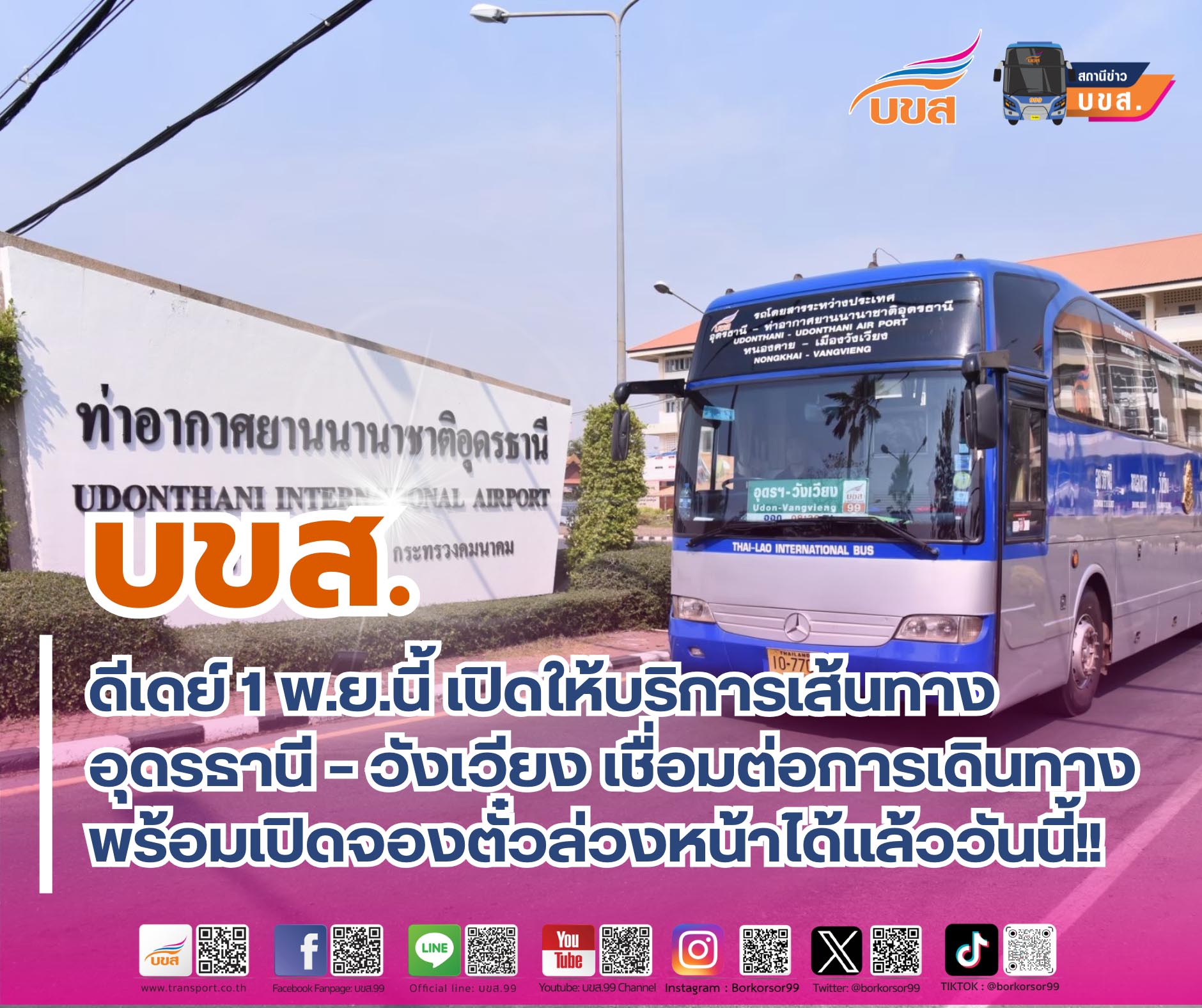 นายอรรถวิท รักจำรูญ กรรมการฯ รักษาการแทนกรรมการผู้จัดการใหญ่ บริษัท ขนส่ง จำกัด (บขส.) กระทรวงคมนาคม เปิดเผยว่า ตั้งแต่วันที่ 1 พฤศจิกายน 2567 เป็นต้นไป บขส. จะกลับมาเปิดให้บริการเดินรถระหว่างประเทศไทย - ลาว เส้นทางที่ 9 อุดรธานี - ท่าอากาศยานนานาชาติอุดรธานี - หนองคาย - วังเวียง เพื่ออำนวยความสะดวกนักท่องเที่ยวในช่วงฤดูหนาว ส่งผลให้เกิดการเดินทางเชื่อมต่อระหว่างสนามบินและรถไฟความเร็วสูง สปป.ลาว - จีน ได้อย่างสะดวก รวดเร็วและไร้รอยต่อ ตามนโยบายนายสุรพงษ์ ปิยะโชติ รัฐมนตรีช่วยว่าการกระทรวงคมนาคม