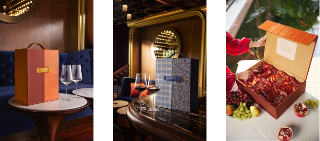 - ชุดกล่องสีส้มพร้อมแก้วไวน์ไฮบริด 2 ใบ (11,850 บาท รวม VAT) มาในสีโทนอุ่นที่ช่วยสร้างบรรยากาศผ่อนคลายเป็นกันเอง