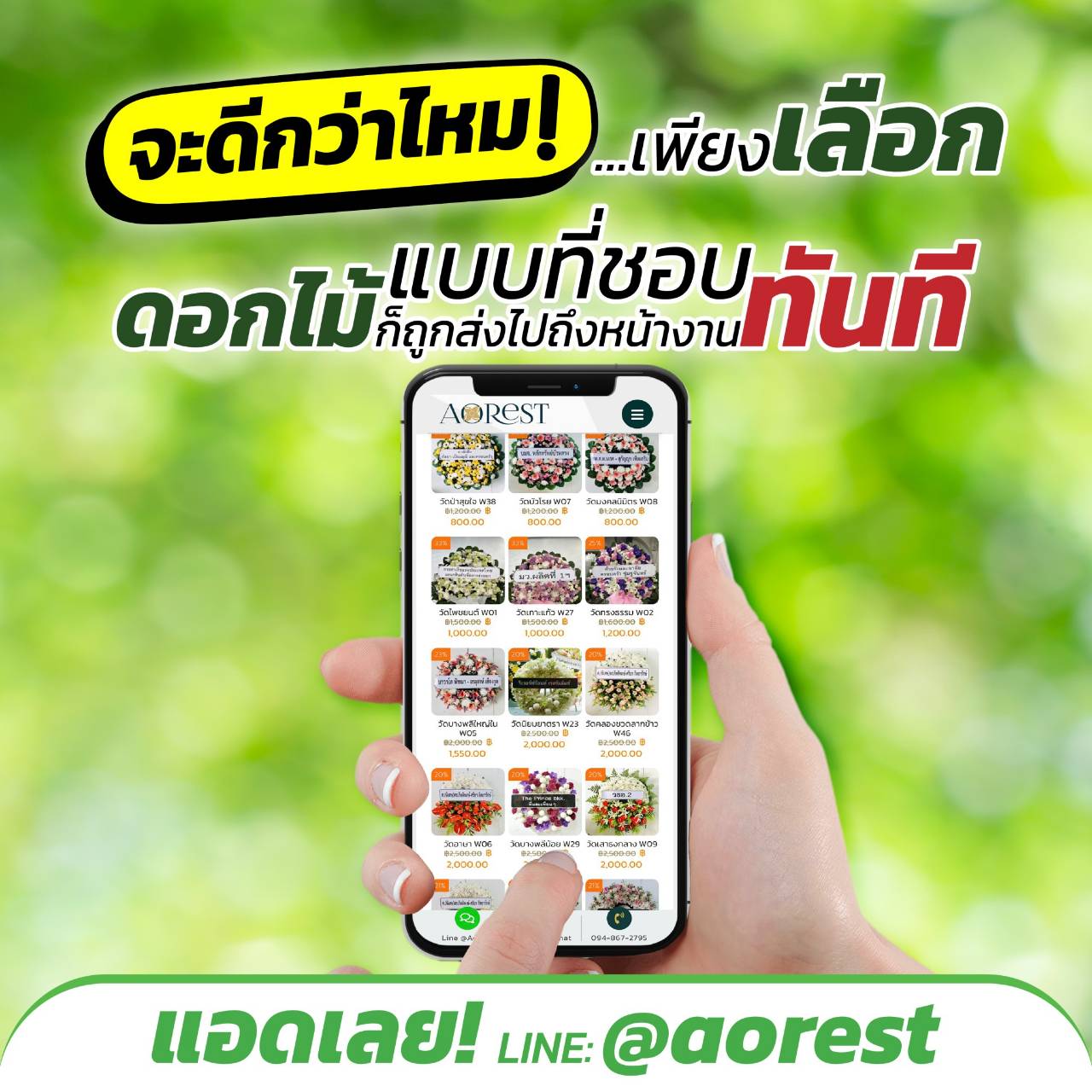 และเพื่อเพิ่มความสะดวกขึ้นไปอีกขั้น AOREST ได้มีการเพิ่มบริการสำหรับสั่งซื้อผ่านช่องทางออนไลน์ทั้งการสั่งซื้อผ่านทางเว็บไซต์และ Line official ของร้าน เพื่อการบริการที่เข้าถึงลูกค้าได้รวดเร็วขึ้นกว่าเดิมภายใน 5 นาที สำหรับการสั่งผ่าน Line official พร้อมบริการการจัดส่งที่พร้อมจัดส่งมาที่หน้างานได้เลยภายในเวลา 24 ชั่วโมงในเขตพื้นที่กรุงเทพและปริมณฑล เราขอร่วมเป็นส่วนหนึ่งในการไว้อาลัยและแสดงความเสียใจสำหรับทุกการจากไป ด้วยการบริการจัดดอกไม้อย่างประณีตและสวยงามเพื่อแสดงความไว้อาลัยให้แก่ผู้ที่ล่วงลับ เราพร้อมบริการทุกออเดอร์ด้วยใจจริง หากสนใจสามารถสั่งซื้อได้ที่เว็บไซต์ https://www.aorest.com/ ,Line official account : @Aorest หรือจะสั่งซื้อง่าย ๆ ผ่านทางเบอร์ 094-867-2795