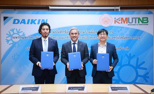 กรุงเทพฯ-ไดกิ้น ลงนามบันทึกข้อตกลงความร่วมมือทางวิชาการ (MOU) กับมหาวิทยาลัยเทคโนโลยีพระจอมเกล้าพระนครเหนือ บูรณาการทำงานร่วมกันใน 2 หลักสูตร เพื่อผลิตและพัฒนากำลังคนทางการศึกษาให้มีความรู้และทักษะด้านเครื่องปรับอากาศ พร้อมความรู้การติดตั้งซ่อมบำรุงระบบปรับอากาศแบบอินเวอร์เตอร์และระบบปรับอากาศแบบรวมศูนย์ หรือ VRV สร้างความพร้อมการทำงานที่ครอบคลุมแก่อุตสาหกรรมเครื่องปรับอากาศในประเทศไทย