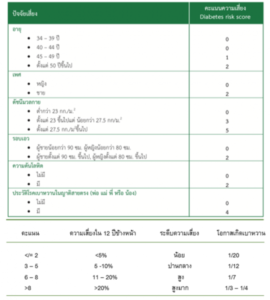 นพ.ธวัชชัย ภาสุรกุล อายุรแพทย์ ศูนย์เบาหวานและต่อมไร้ท่อ โรงพยาบาลนวเวช ได้กล่าวถึงปัจจัยเสี่ยงต่อการเกิดเบาหวานว่ามีหลายอย่าง และน้ำหนักของแต่ละอย่างก็ไม่เท่ากัน มีงานศึกษาปัจจัยเสี่ยงหลาย ๆ อย่างของเบาหวาน แล้วนำข้อมูลมาคำนวณเป็นคะแนนความเสี่ยงต่อการเกิดเบาหวานในอนาคต ซึ่งสามารถใช้ทำนายความเสี่ยงในอีก 12 ปีข้างหน้าได้อย่างแม่นยำพอสมควรในคนไทย