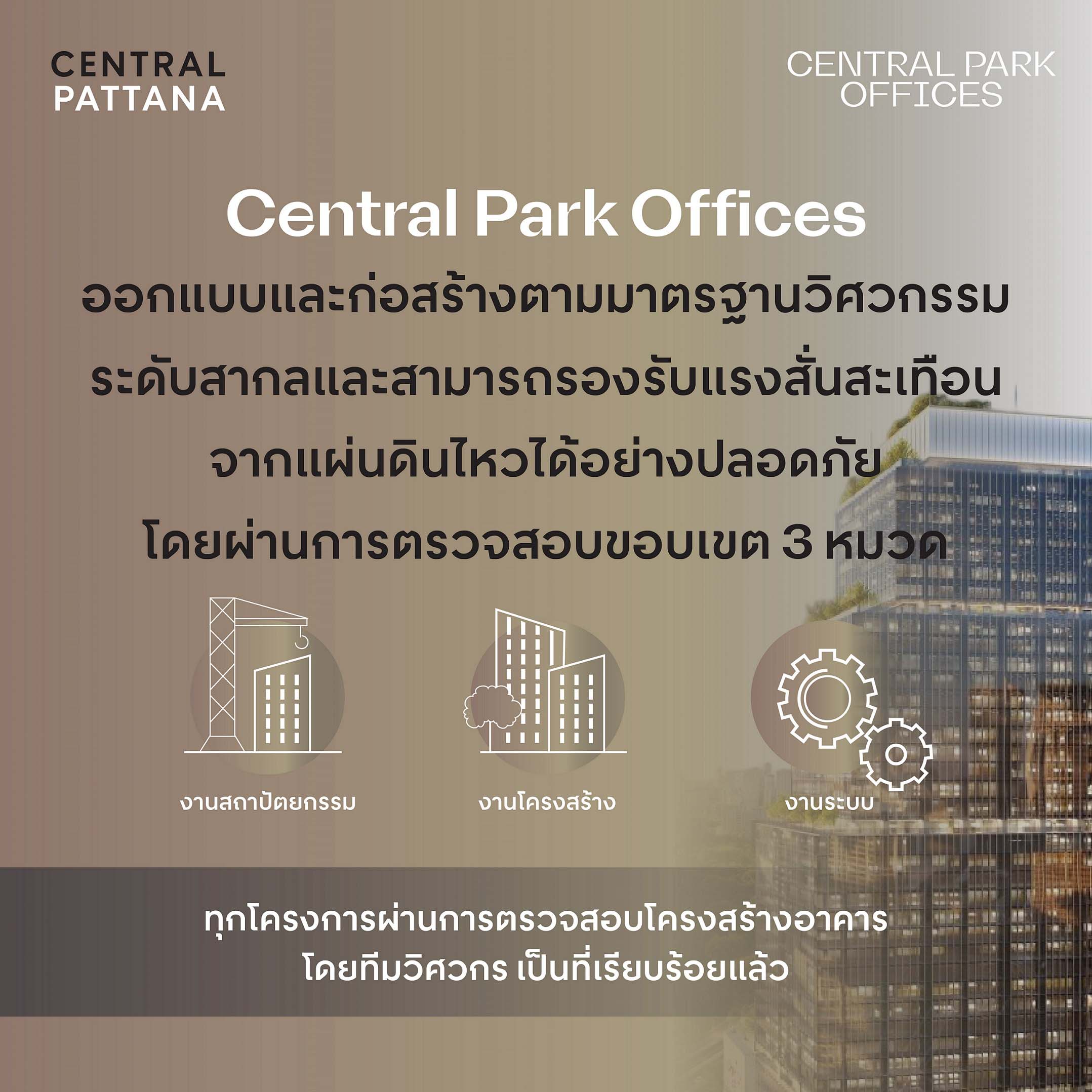 โดยโครงการ Central Park Offices เป็นอาคารสำนักงานแห่งที่ 11 ที่กำลังอยู่ในระหว่างการก่อสร้างโดยบริษัท ฤทธา จำกัด หนึ่งในผู้รับเหมาชั้นนำของไทยที่มีประสบการณ์มากกว่า 38 ปี ในการก่อสร้างอาคารขนาดใหญ่ และได้รับความไว้วางใจจากโครงการระดับประเทศหลายแห่ง ทั้งนี้ การตรวจสอบอาคารดำเนินการโดยทีมวิศวกรผู้ควบคุมงานของโครงการ ร่วมกับวิศวกรผู้เชี่ยวชาญจากภายนอกและผู้ตรวจสอบอาคารที่ได้รับใบอนุญาตจากสภาวิศวกรตามประกาศกรุงเทพมหานคร ครอบคลุมงานโครงสร้าง สถาปัตยกรรม และงานระบบประกอบอาคาร พบว่าอาคารไม่มีความเสียหาย พร้อมเดินหน้าก่อสร้างอย่างมั่นคง สะท้อนถึงศักยภาพและความเชี่ยวชาญจากประสบการณ์ตลอด 45 ปีของเซ็นทรัลพัฒนา ในการพัฒนาอสังหาริมทรัพย์ระดับประเทศ โดยเฉพาะการออกแบบโครงสร้างที่มีความแข็งแรงทัดเทียมอาคารสำนักงานระดับโลก ซึ่งช่วยให้โครงการสามารถเดินหน้าก่อสร้างต่อได้ตามแผนงานเดิมอย่างมั่นคงและปลอดภัยตามหลักการที่บริษัทให้ความสำคัญเสมอมา”