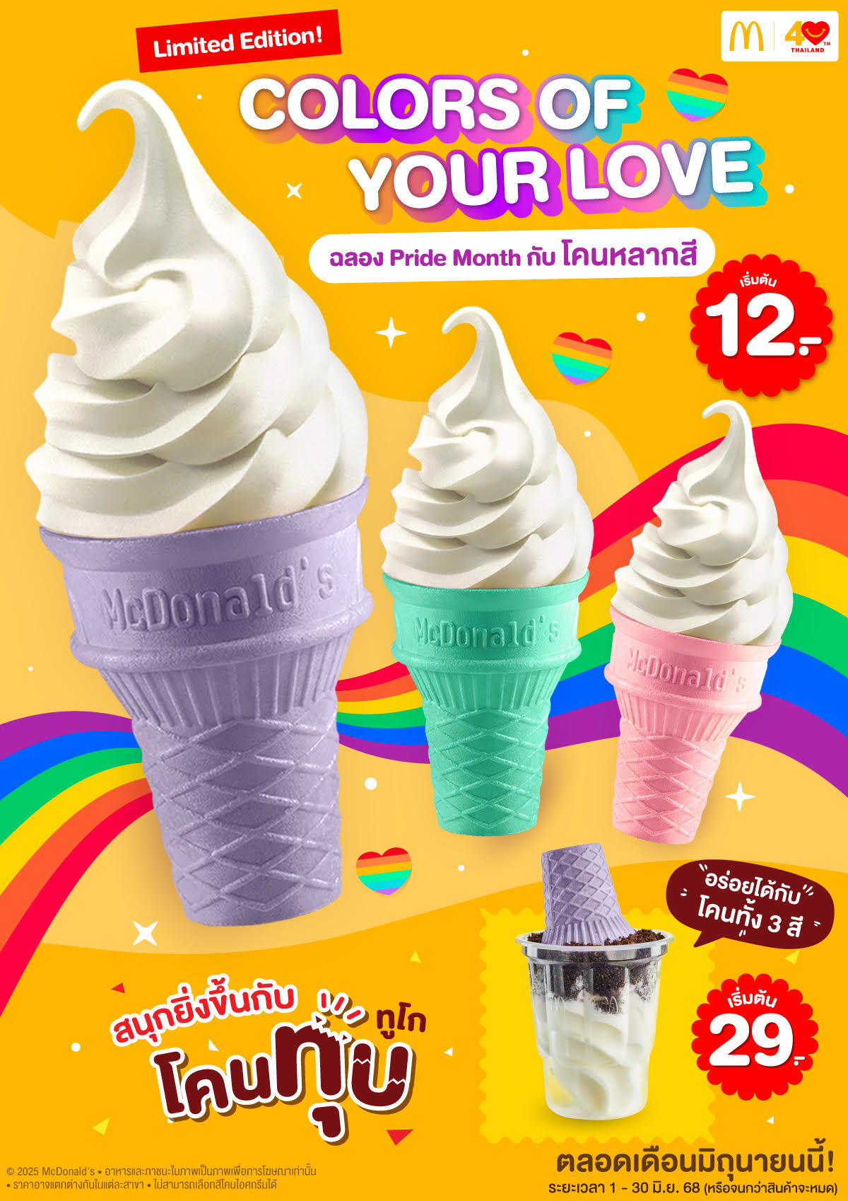 กรุงเทพฯ (30 พฤษภาคม 2568) – แมคโดนัลด์ ร่วมฉลอง ‘PRIDE MONTH’ สนับสนุนทุกความรักและความหลากหลายอย่างเท่าเทียม ผ่านแคมเปญพิเศษ “COLORS OF YOUR LOVE” ชวนทุกคนมาเติมสีสันให้ทุกความรัก กับไอศกรีมสุดคิ้วท์ “โคนหลากสี” ซอฟท์เสิร์ฟวานิลลา มาพร้อมโคนสีสันสดใส 3 สี ทั้งสีม่วง สีชมพู และสีเขียว ราคาเริ่มต้นเพียง 12 บาท เพิ่มความสนุกได้ยิ่งขึ้นกับเมนู “โคนทุบหลากสี ทูโก” ไอศกรีมวานิลลา โรยโอรีโอครัมป์จุใจ มาพร้อมโคนหลากสีให้ “ทุบ” แล้วอร่อยกรุบกรอบแบบลงตัว ราคาเริ่มต้นเพียง 29 บาท